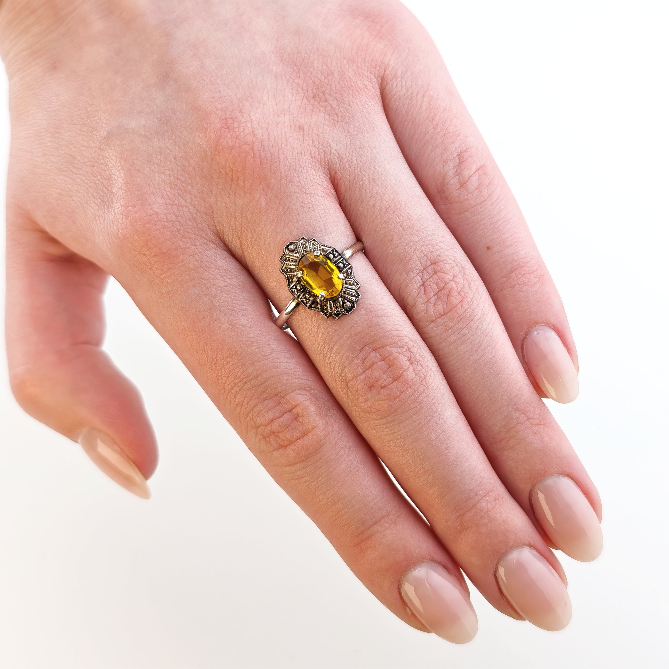 Art-Déco Silberring mit gelbem Citrin in Ovalschliff