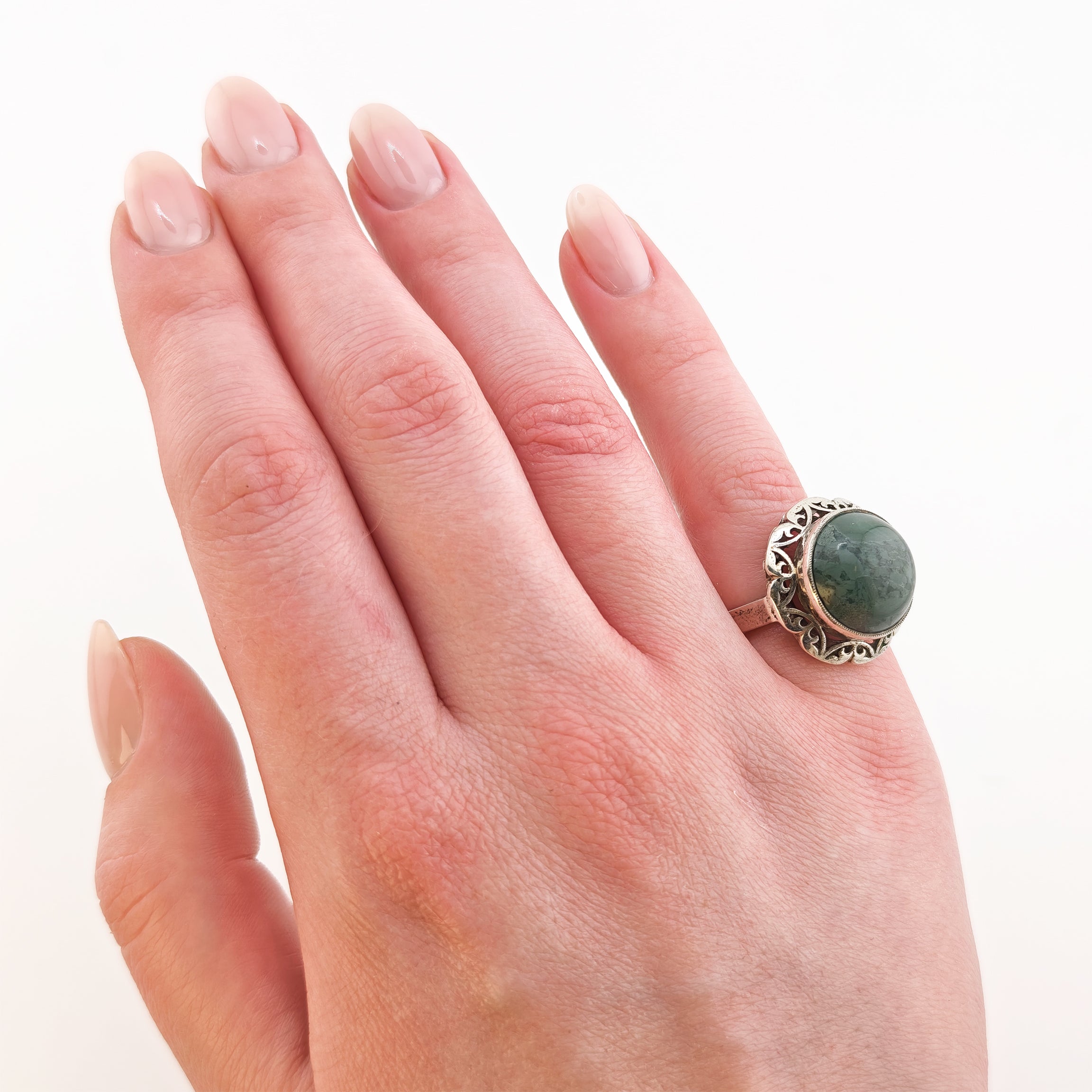 Art Nouveau-Silberring mit grünem Achat-Cabochon um 1930