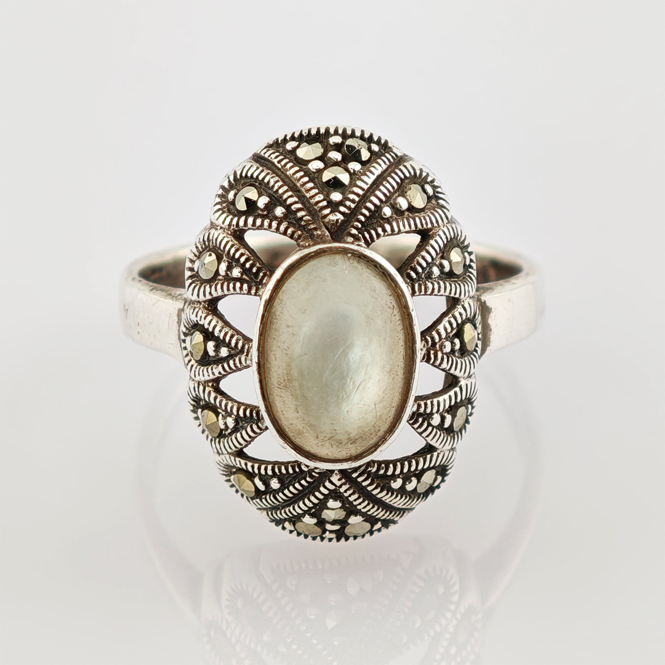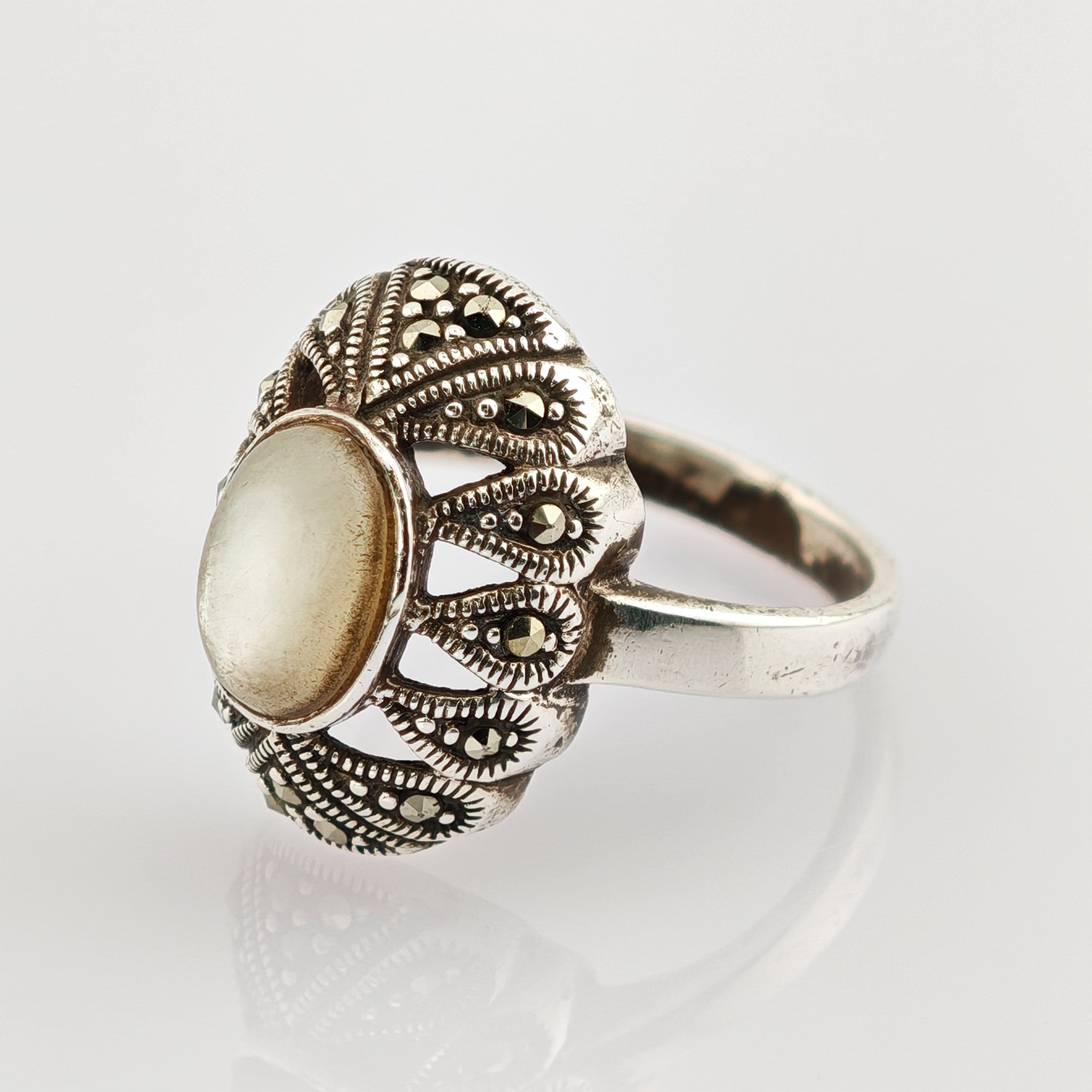 Art-Déco Silberring mit Mondstein und Markasiten aus den 1930er Jahren
