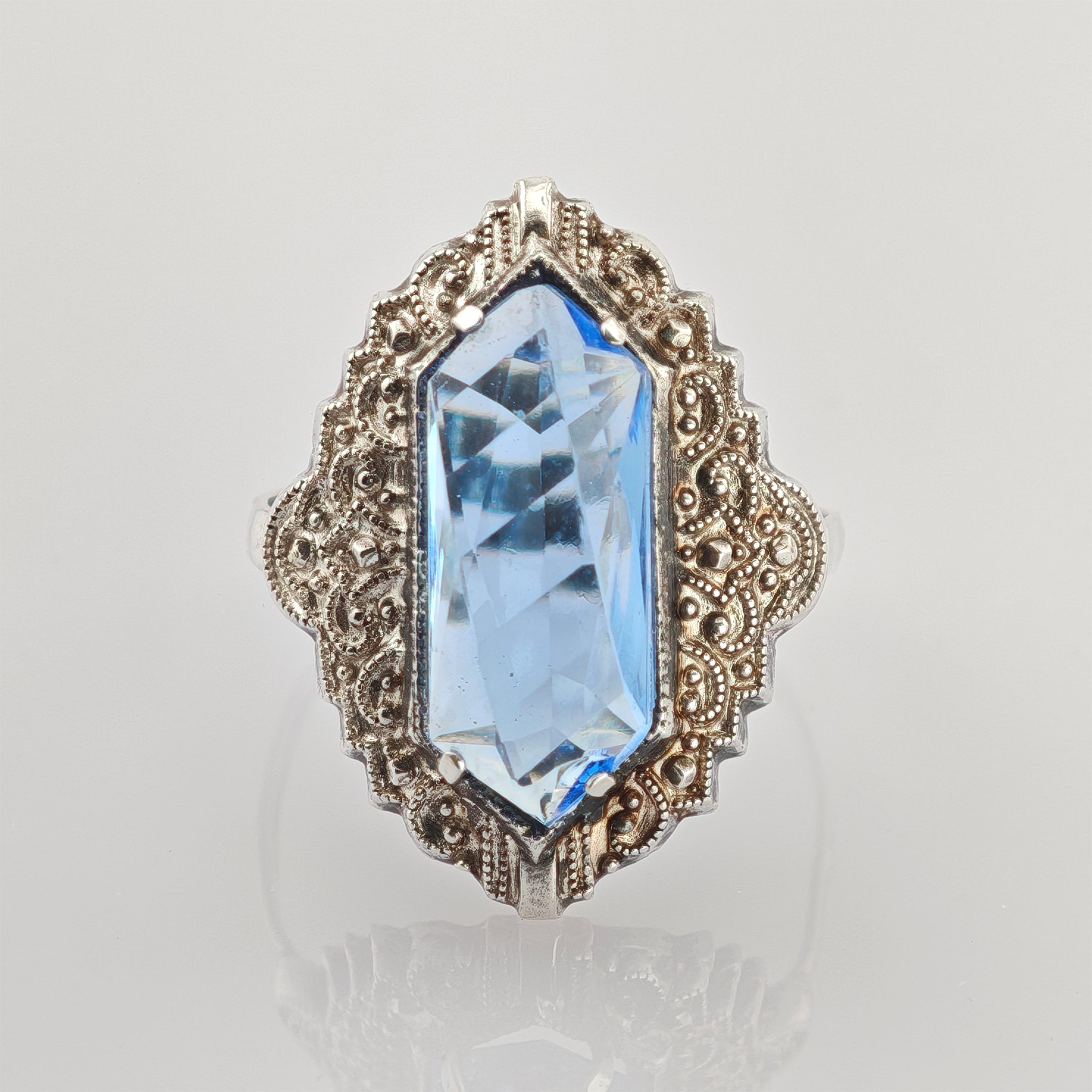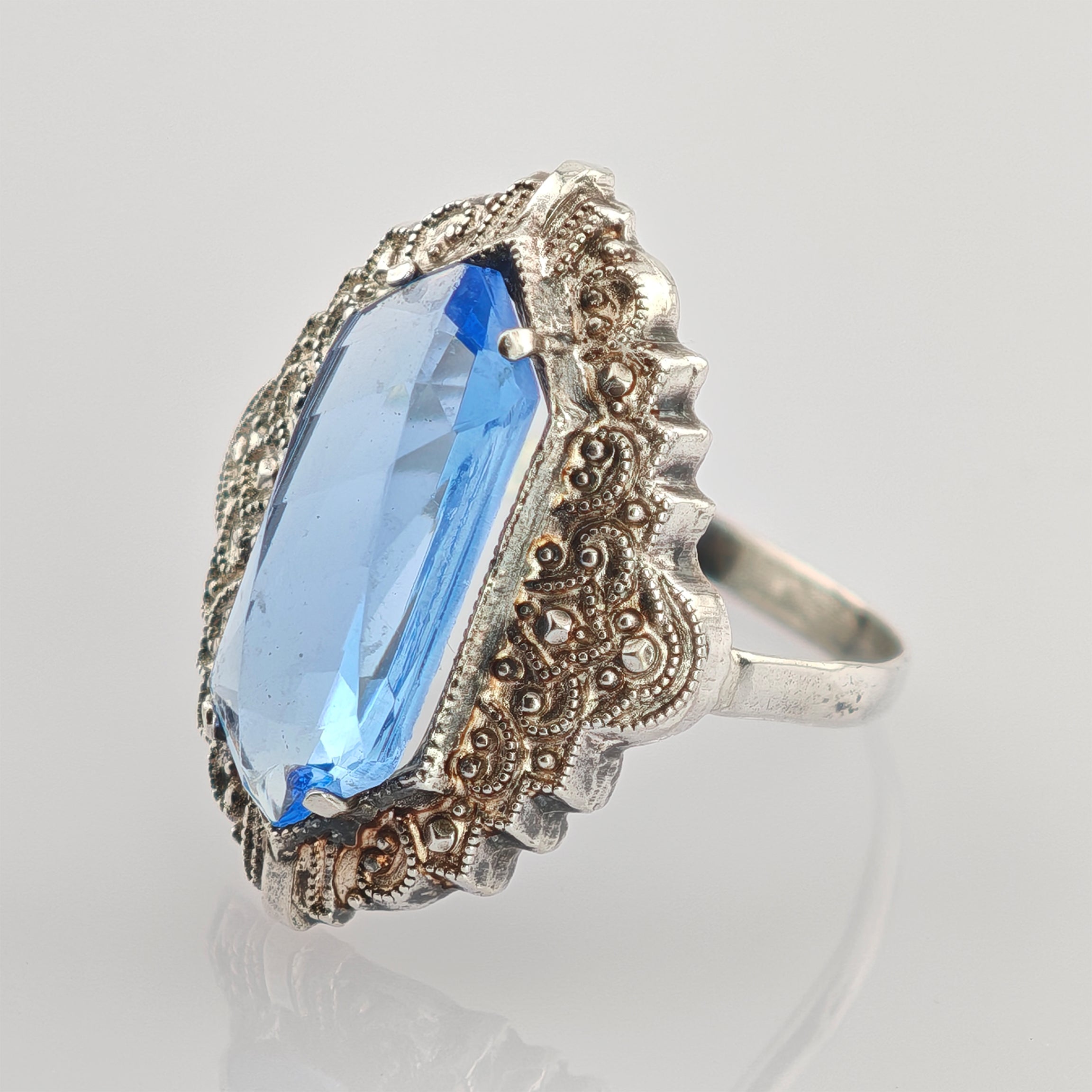 Art-Déco-Silberring mit großem blauem Glasstein aus den 1970er Jahren