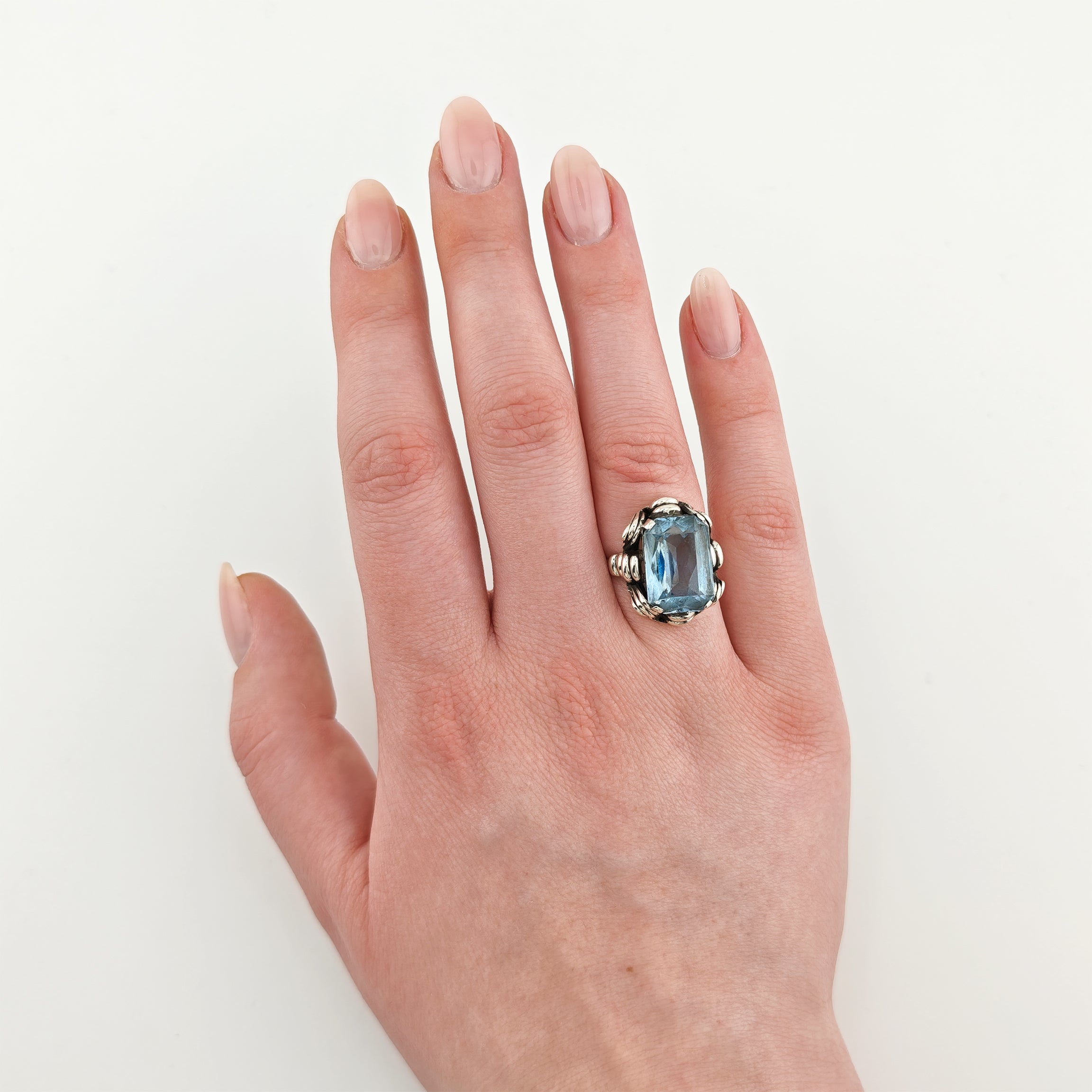 Cocktailring aus Silber mit blauem großem Topas in Radiantschliff, ca. 1960