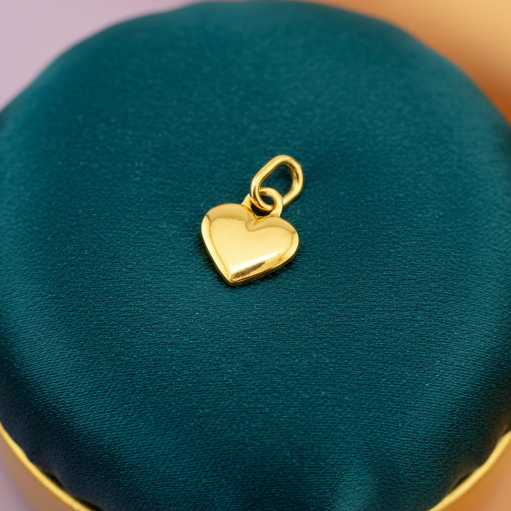 Kleiner glänzender goldener Herzanhänger mit Schlaufe auf weißem Hintergrund.