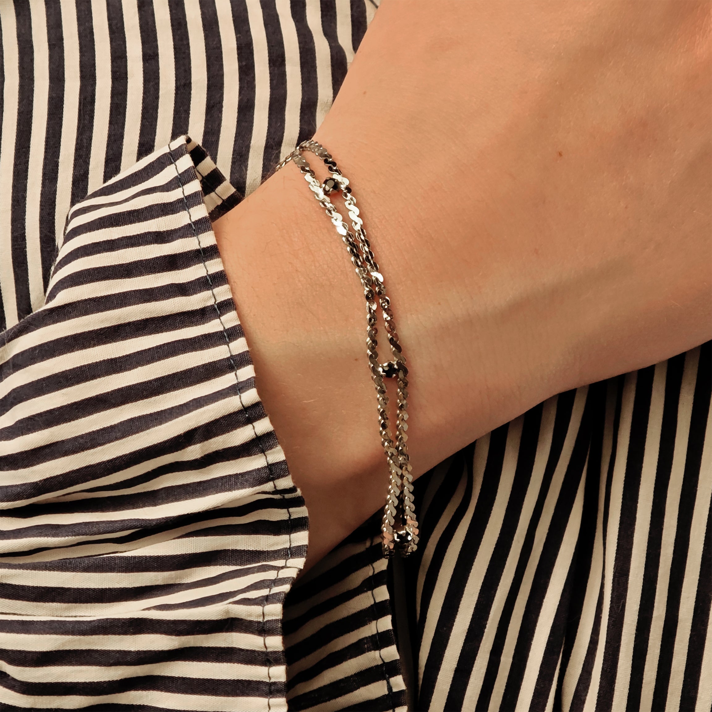 Silbernes Armband mit doppelter Kettenoptik und kleinen schwarzen runden Edelsteinen auf weißem Hintergrund.