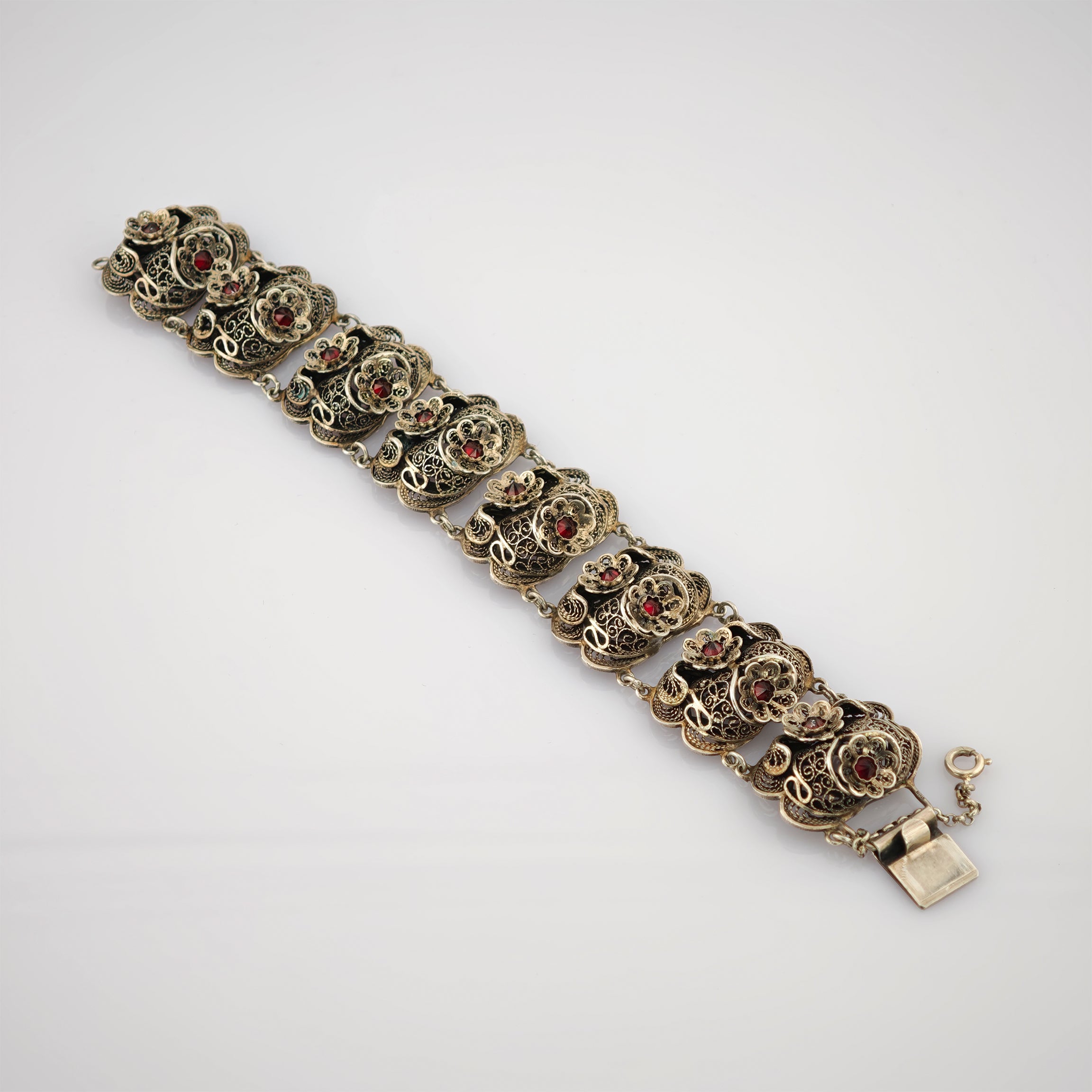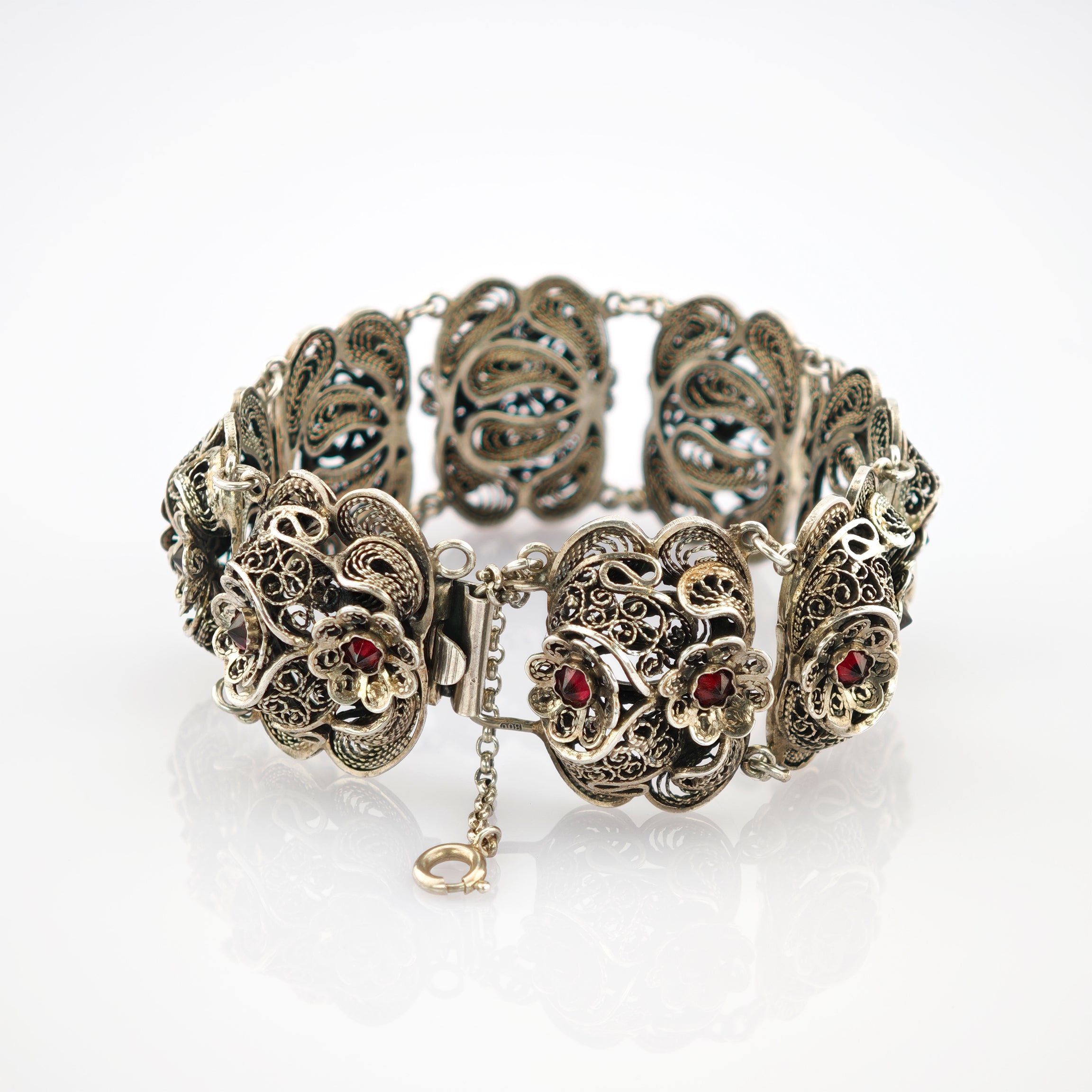 Die Kombination aus feiner Silberfiligranarbeit und der warmen Intensität der Granate ist typisch für die Kunst der 1930er bis 1950er Jahre – eine Zeit, in der klassische Formen und handgefertigte Details Ausdruck von Eleganz und Stilbewusstsein waren. Der stabile Kastenverschluss mit Sicherheitskette rundet das hochwertige Design ab und sorgt für sicheren Tragekomfort.