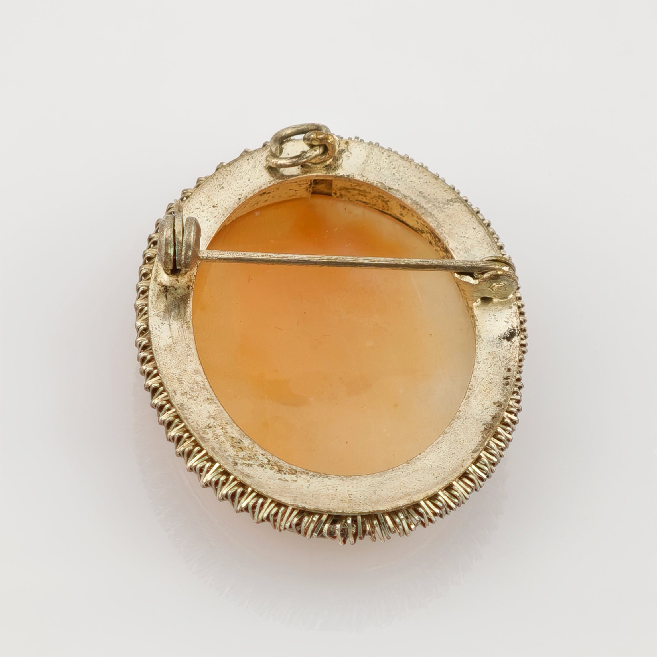 Diese Kamee-Brosche zeigt die klassische Eleganz des 19. Jahrhunderts in ihrer reinsten Form. Zart aus Muschelschale geschnitten, präsentiert sie das Profil einer jungen Frau mit kunstvoll aufgestecktem Haar, sanft geneigtem Kopf und feinen Gesichtszügen – ein Sinnbild für Anmut, Tugend und zeitlose Schönheit. Die vergoldete Fassung mit filigraner Kordelverzierung rahmt das Relief harmonisch ein und unterstreicht seine noble Ausstrahlung.