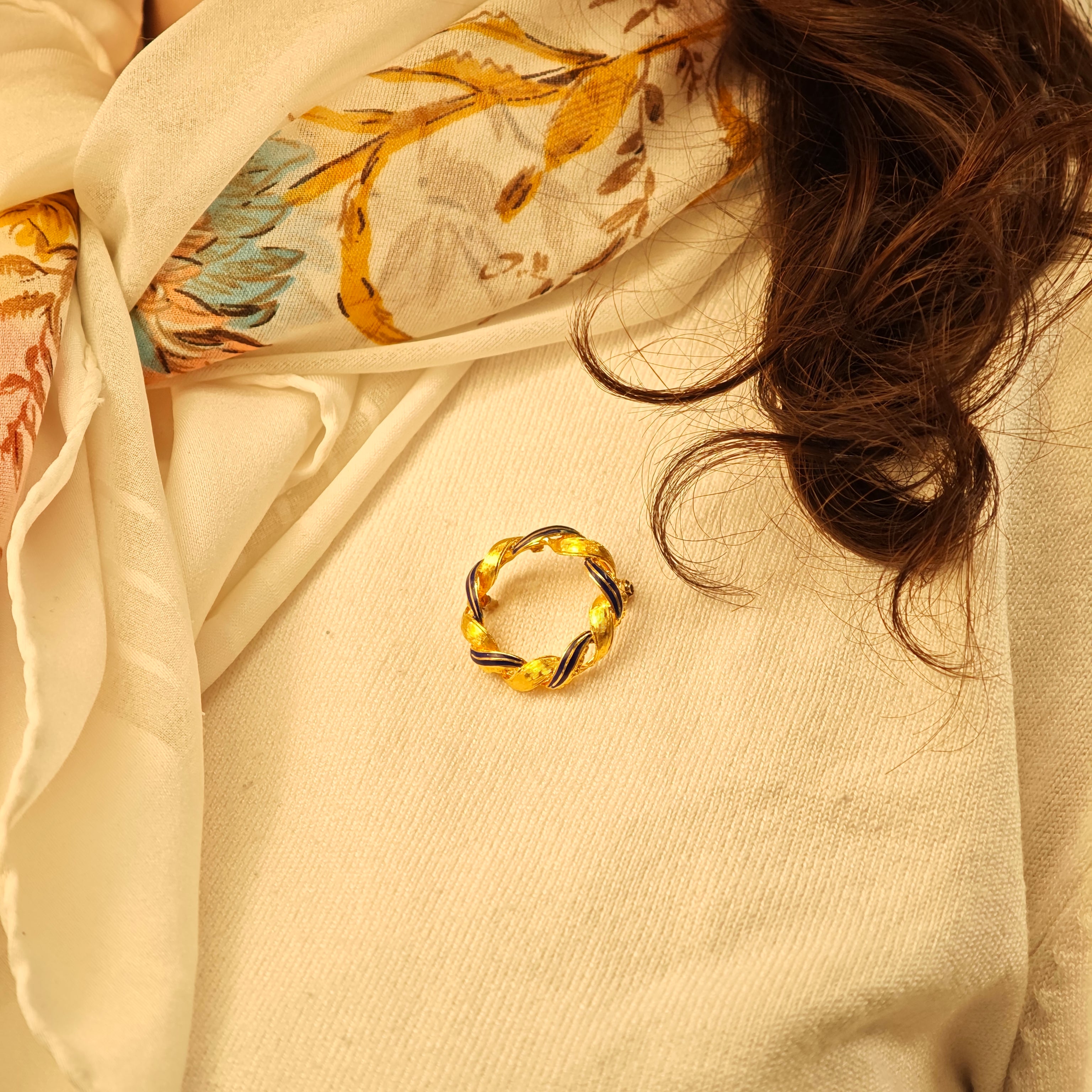 Diese elegante Brosche aus 750er Gold bezaubert durch ihr kunstvolles Flechtdesign, das Bewegung und Harmonie zugleich ausstrahlt. Die feine Oberflächenstruktur des Goldes wird durch die tiefblaue Emaille meisterhaft ergänzt, wodurch ein edler Farbkontrast entsteht, der zeitlose Raffinesse vermittelt.