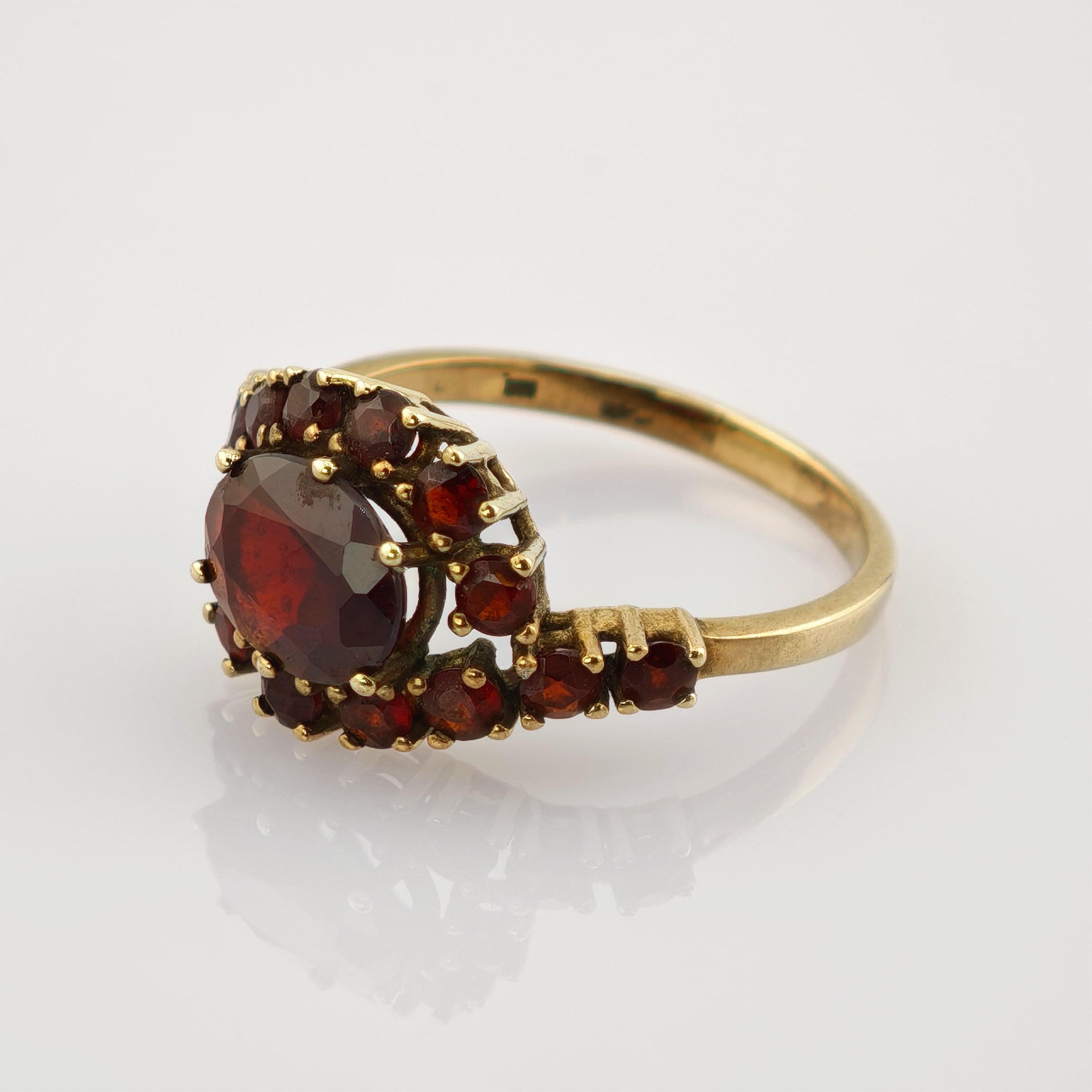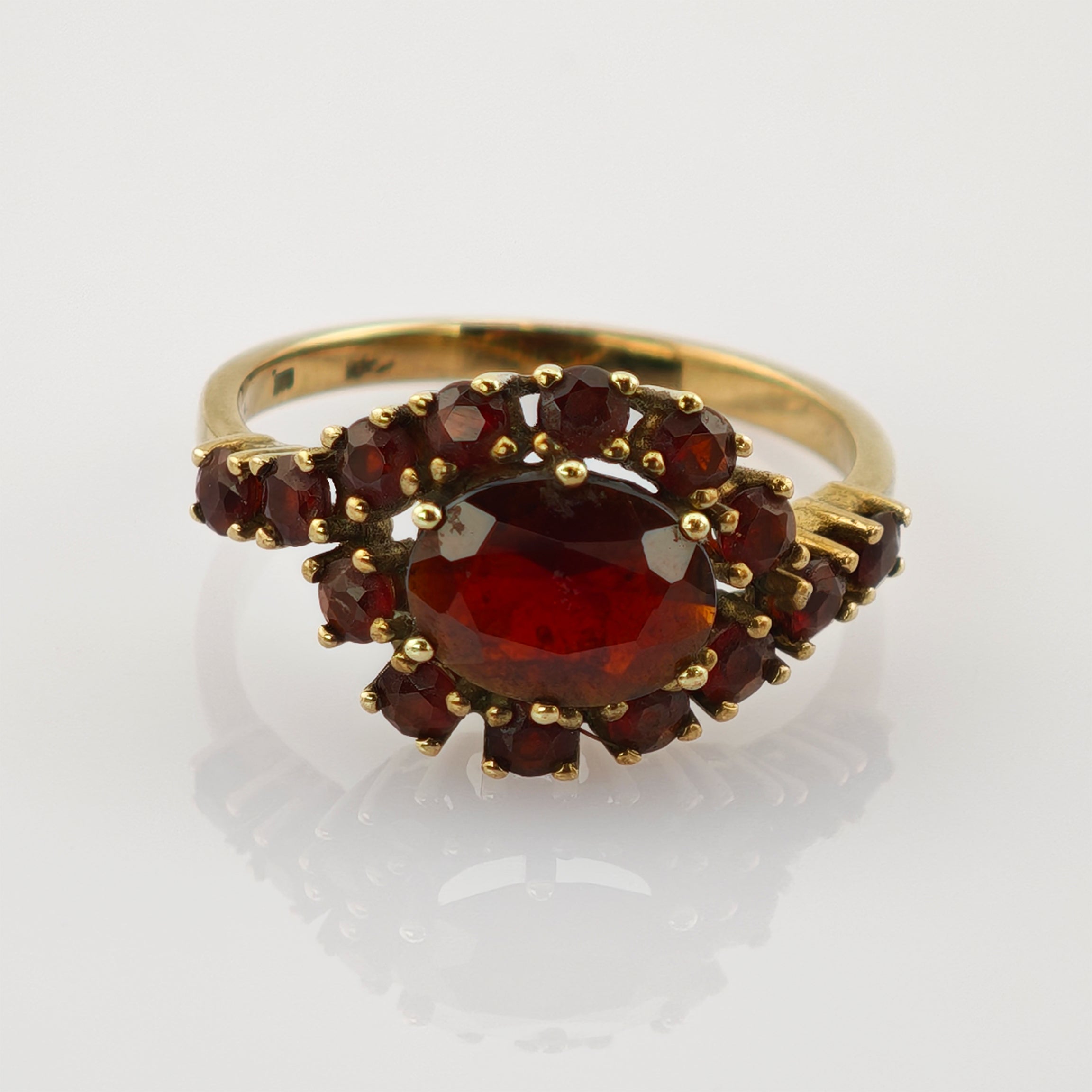 Dieser ausdrucksstarke Ring aus 333er Gold bezaubert mit seiner warmen Farbkomposition und opulenten Ausstrahlung. Im Mittelpunkt steht ein oval facettierter Granat von tiefroter, fast weinfarbener Intensität, umgeben von kleineren Granaten, die das Licht in warmen Reflexen brechen. Die harmonische Anordnung der Steine verleiht dem Schmuckstück eine leuchtende Tiefe und ein feuriges Funkeln.