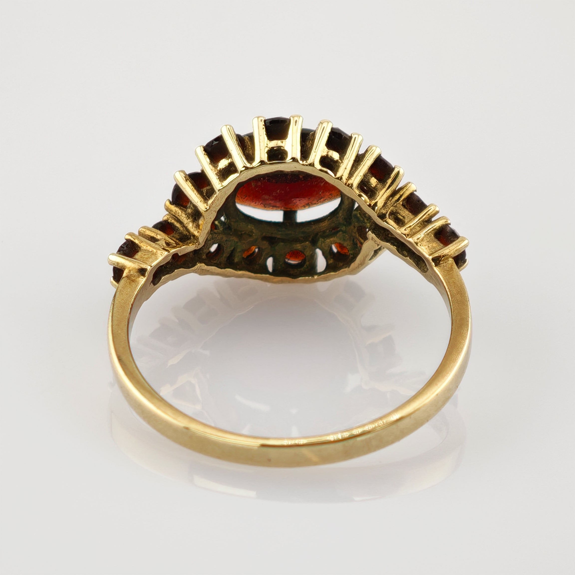 Das detailreiche Design erinnert an die romantische Juwelierkunst der 1970er Jahre, als Granate mit ihrem geheimnisvollen Glanz große Beliebtheit genossen. Die filigrane Krappenfassung und die leicht erhöhte Form unterstreichen die handwerkliche Präzision und geben dem Ring eine elegante Präsenz.
