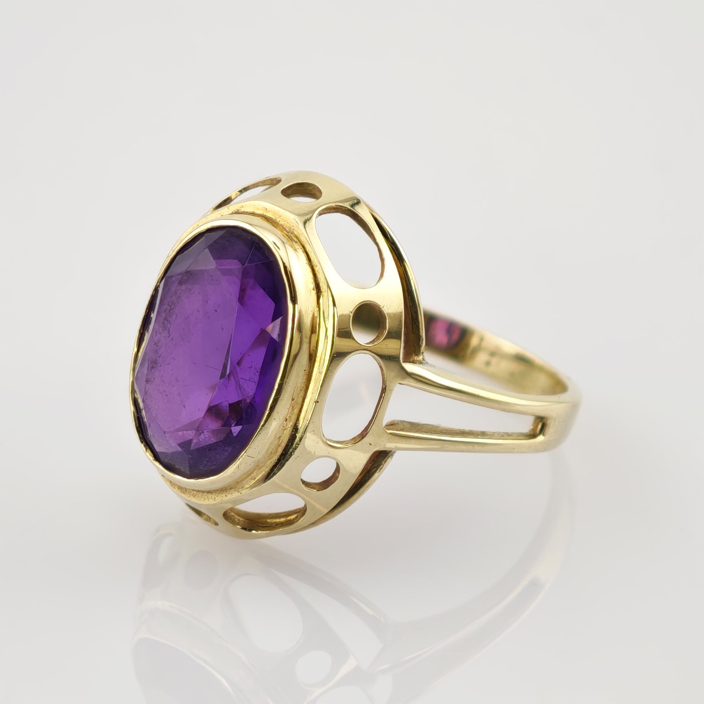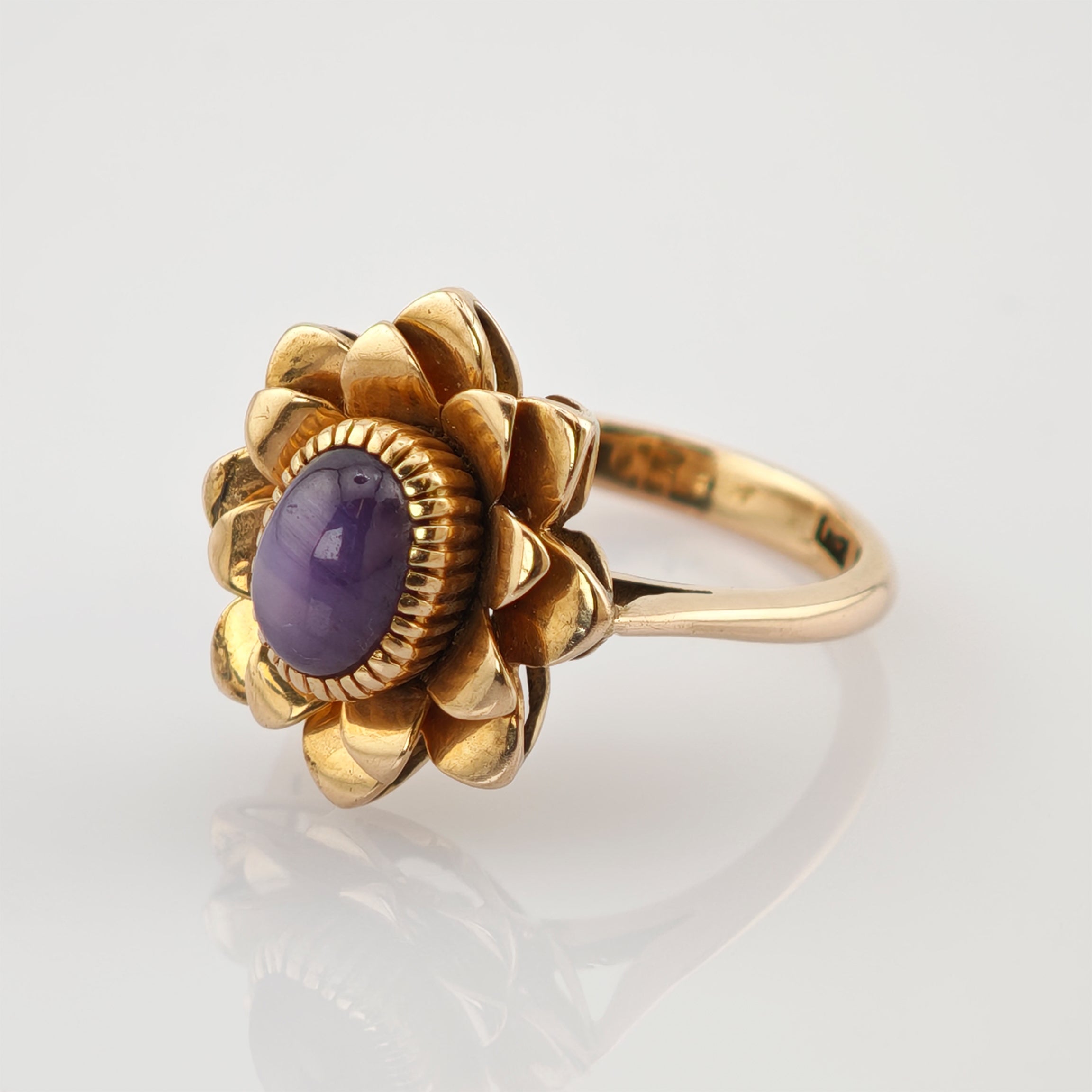 Nahaufnahme einer Hand mit pastellrosa Nägeln und Goldring mit violettem Edelstein am Mittelfinger