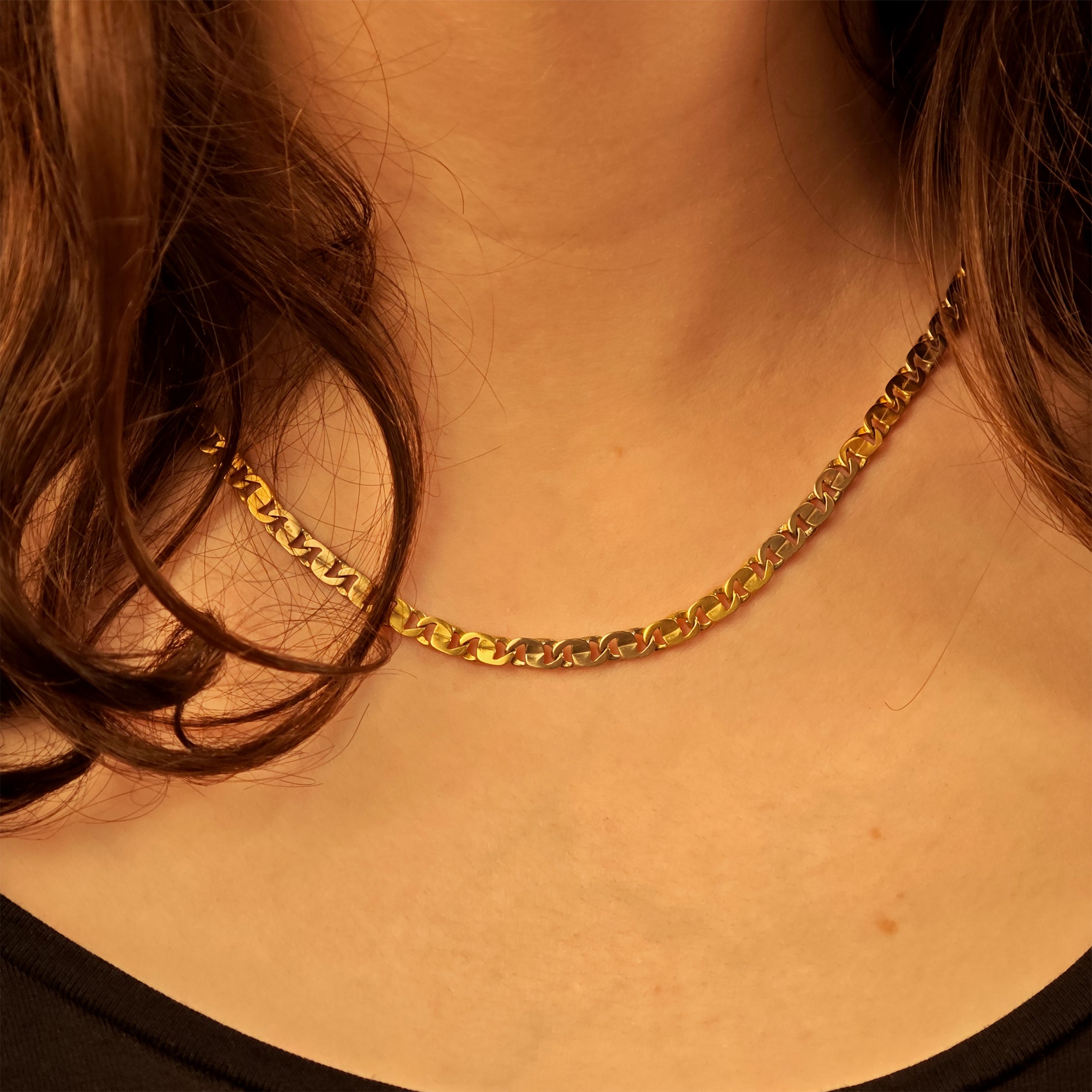 Zweifarbige Metallkette mit gold- und silberfarbenen flachen Gliedern und mittigem Karabinerverschluss.