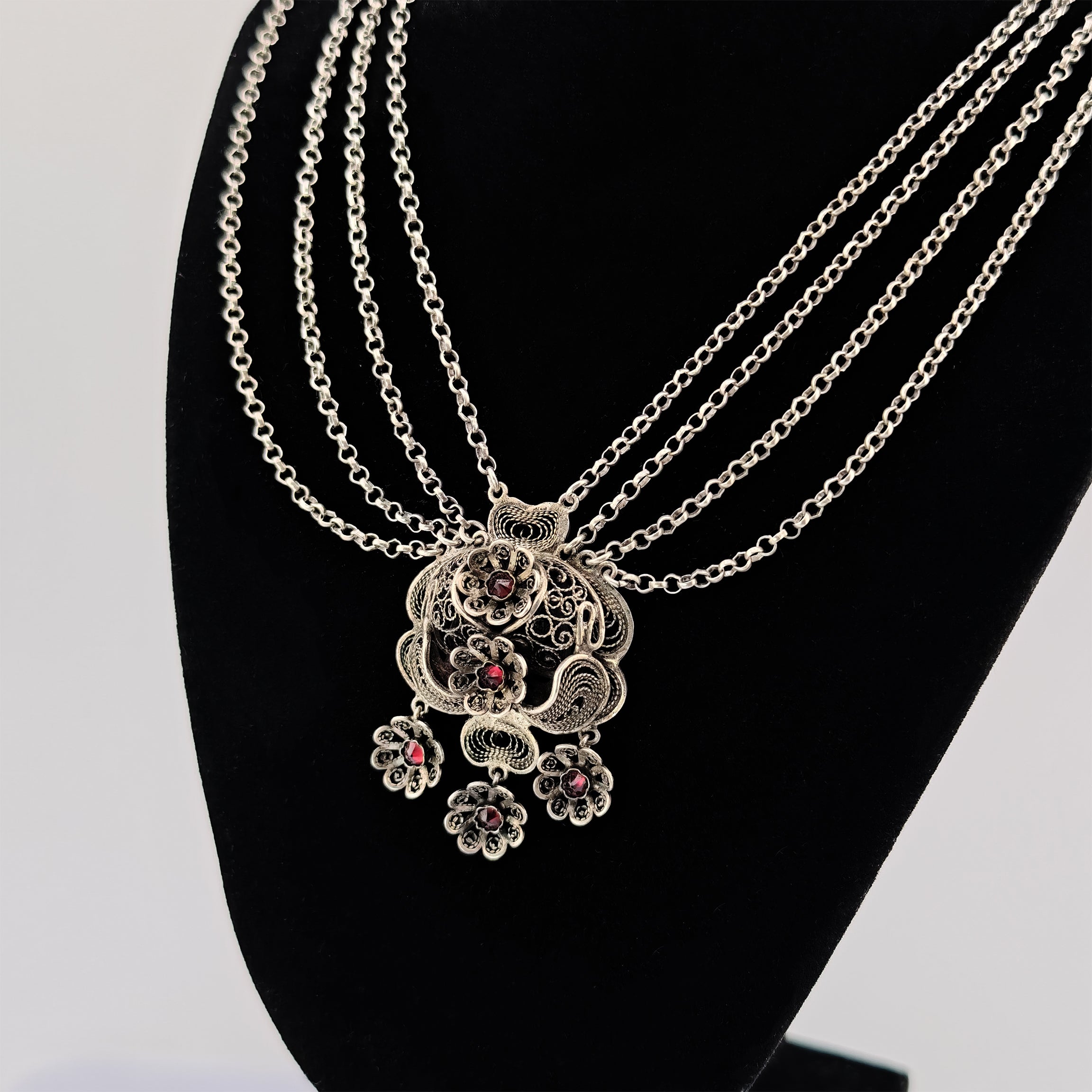 Dieses ausdrucksstarke Silbercollier entfaltet seine Wirkung durch ein reich gegliedertes Mittelteil, das von mehreren fein gearbeiteten Kettensträngen gehalten wird. Im Zentrum ruht ein ornamental aufgebautes Medaillon, aus dem sich kleine, beweglich gelagerte Anhänger lösen. Tiefrote Granate setzen leuchtende Akzente und bilden einen ruhigen, warmen Kontrast zum kühlen Schimmer des Silbers. Die Komposition wirkt ausgewogen und zugleich lebendig, getragen von einer klaren Symmetrie und einer fein durchdachten Abfolge von Formen.