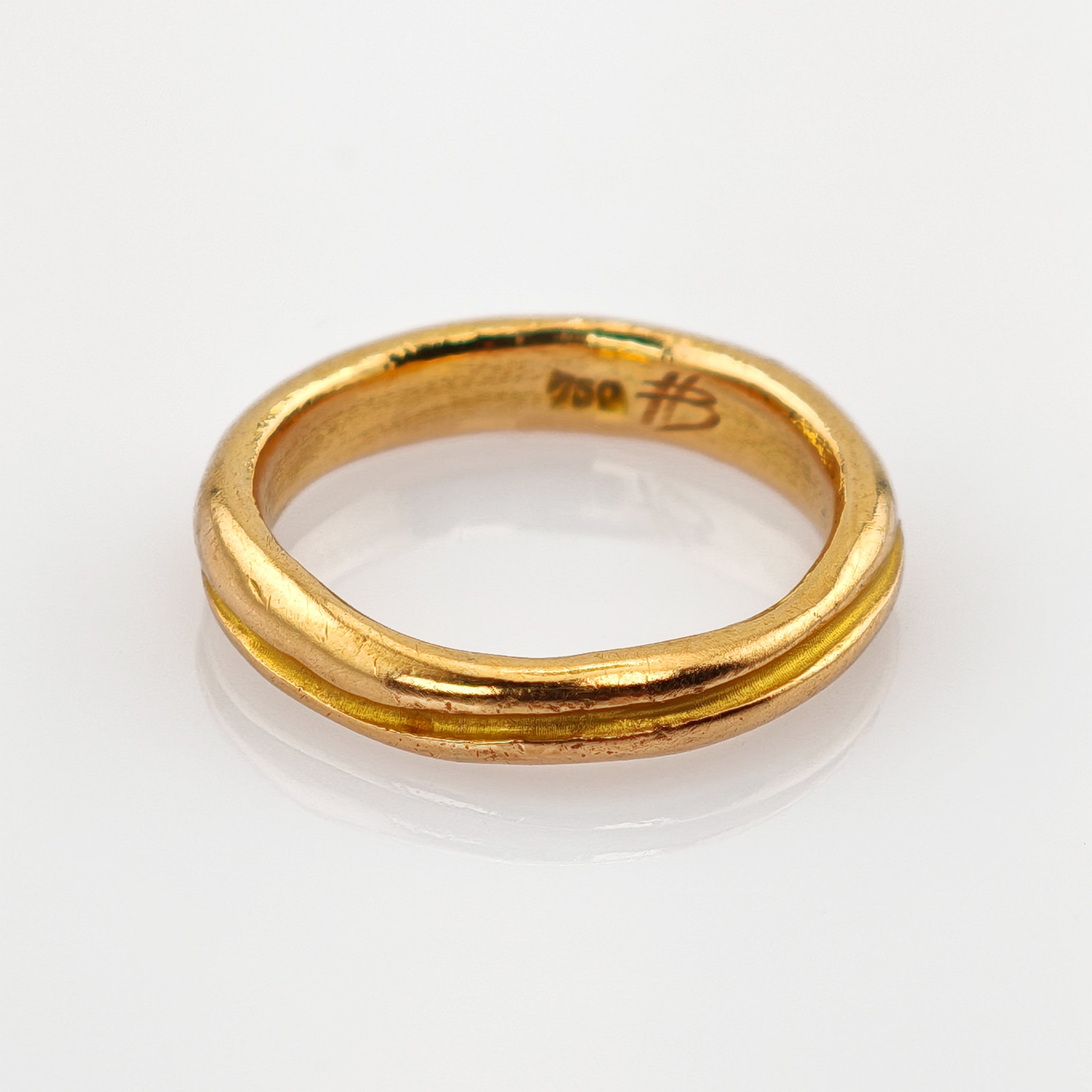 Der Ring ist ein klassisches Symbol für Beständigkeit und Liebe. Gefertigt aus edlem 750er Gelbgold, zeigt er eine elegante, leicht gedrehte Form, die sanft das Licht einfängt und die Oberfläche lebendig wirken lässt.