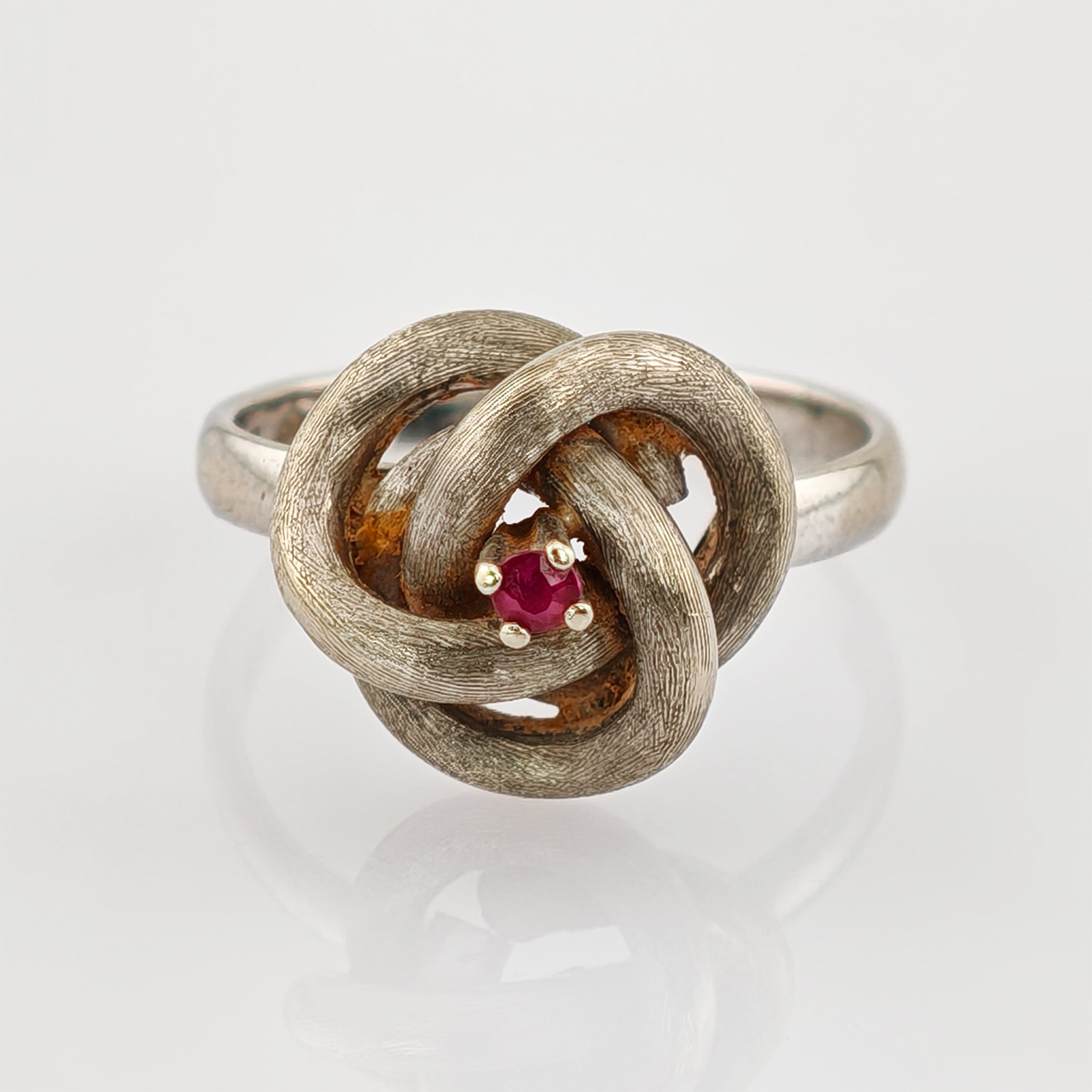 Das Zentrum bildet ein kunstvoll verschlungener Knoten, Sinnbild für Zusammenhalt, Treue und ewige Liebe. Inmitten der filigranen Verschlingungen funkelt ein leuchtend roter Rubin, der als Stein der Leidenschaft und Energie gilt. Der sanfte Glanz des Weißgolds harmoniert perfekt mit dem warmen Feuer des Rubins und schafft so ein besonders ansprechendes Farbspiel.