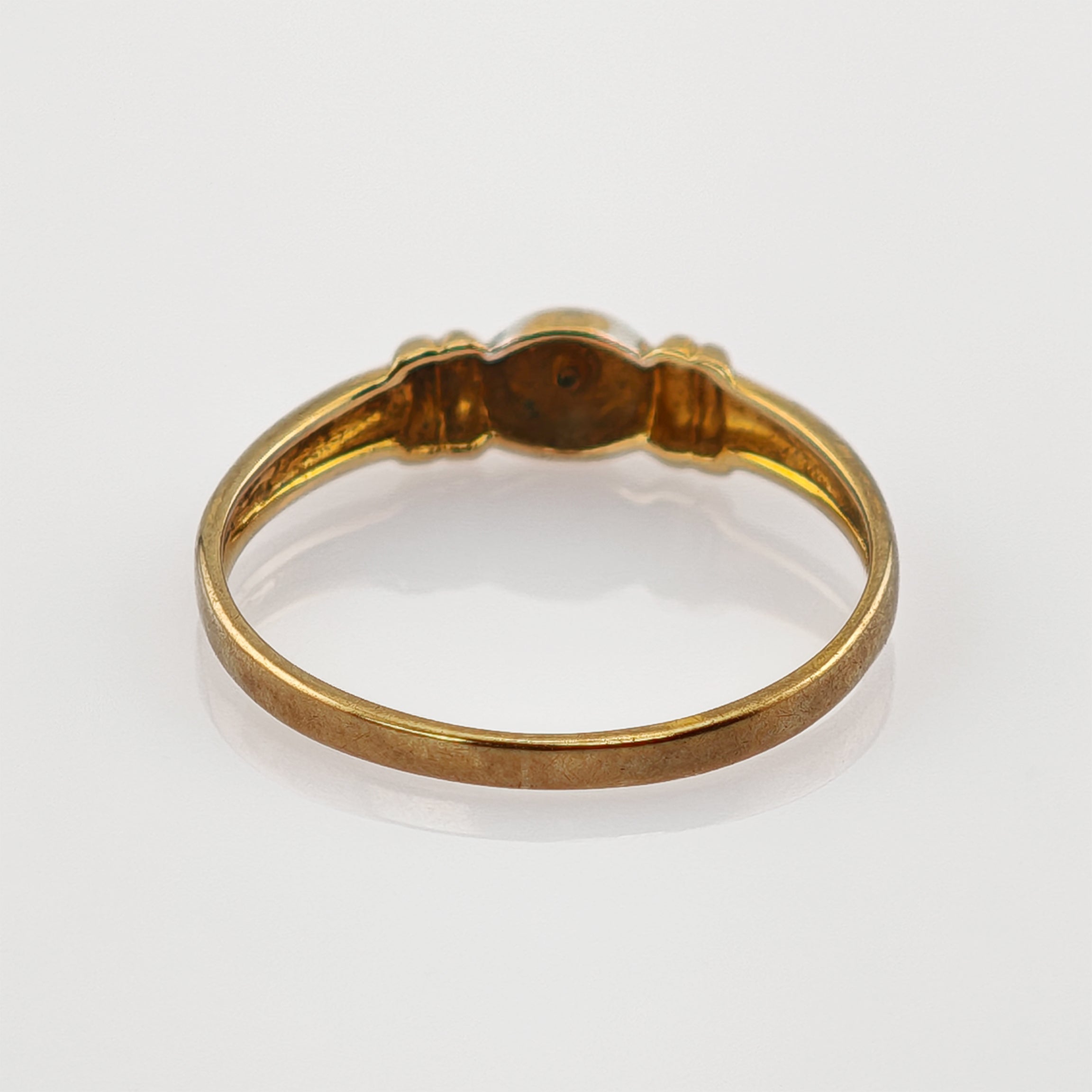Dieser filigrane Ring vereint schlichte Eleganz mit einem Hauch von klassischem Luxus. Gefertigt aus hochwertigem Gelbgold, präsentiert sich dieses Vintage-Schmuckstück mit einer feinen Linienführung und einem edlen Zentrum, das von einem Diamanten (0,01 ct) in einer sanft erhöhten, runden Fassung gekrönt wird.