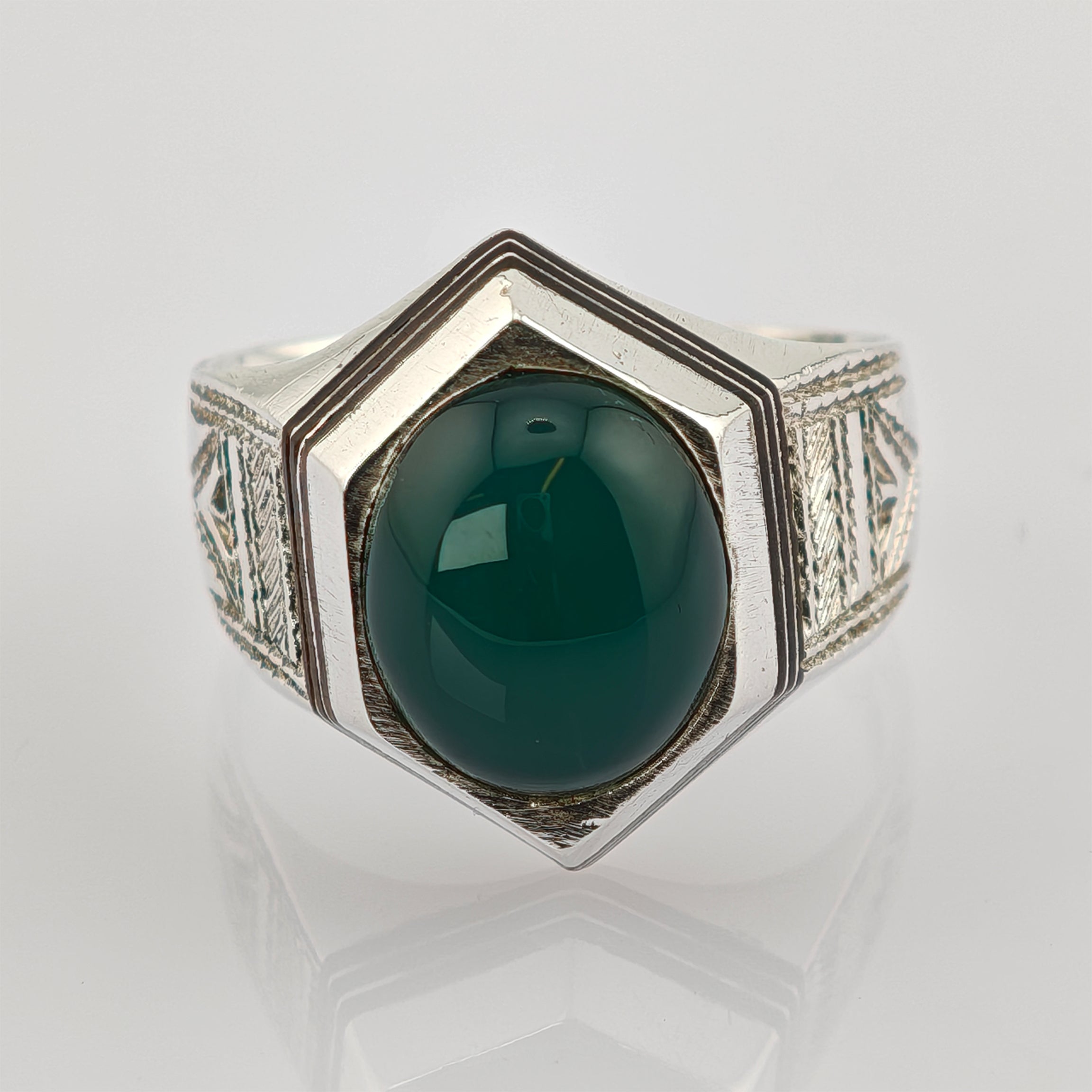 Ein markanter Siegelring aus 925er Silber, der klare Geometrie mit der Tiefe eines Natursteins verbindet. Im Zentrum sitzt ein etwa 4 ct schwerer grüner Achat im Herzschliff, dessen dunkles Waldgrün ruhig leuchtet und je nach Lichteinfall eine edle, fast samtige Tiefe zeigt.