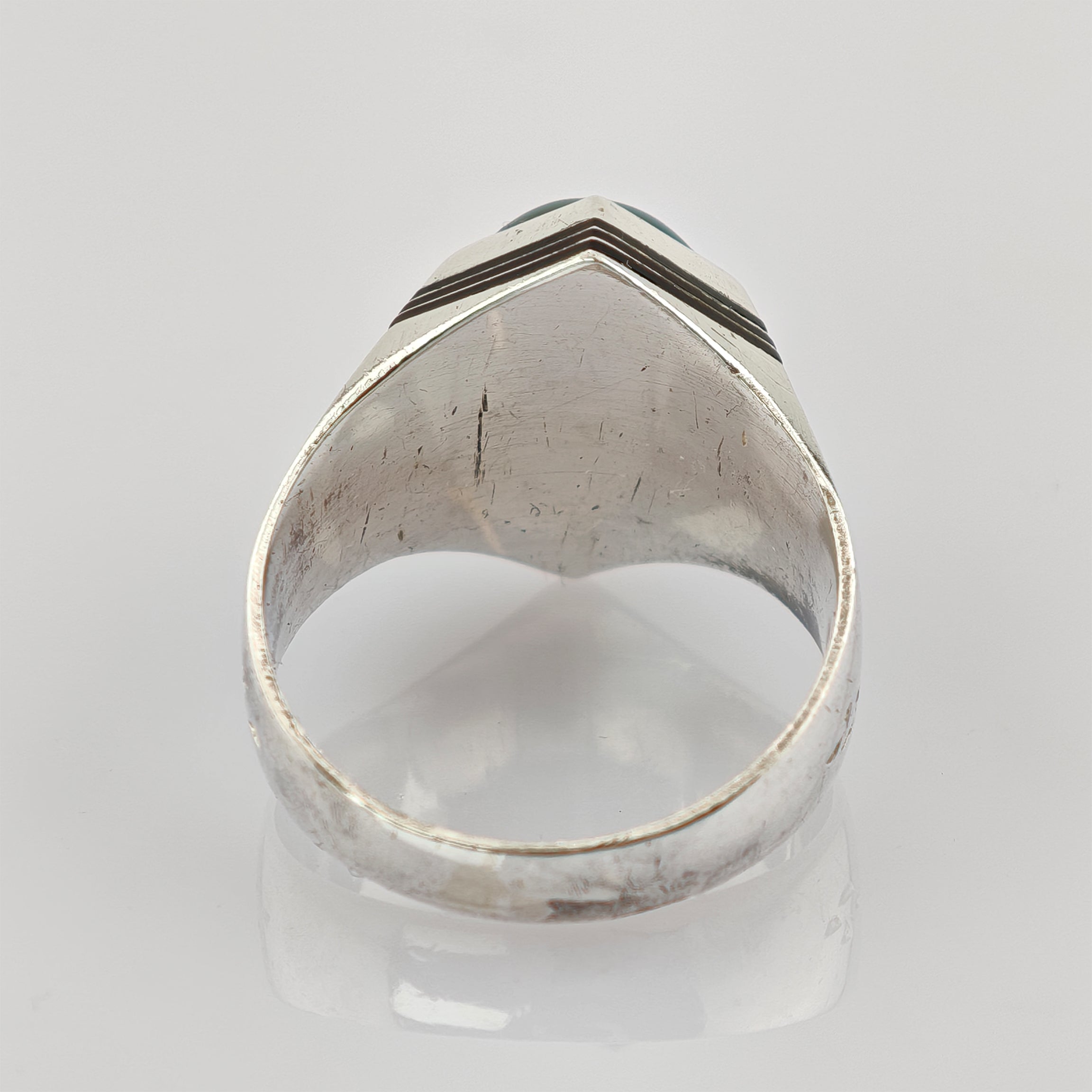 Der Stein ist in einen kräftigen, sechseckigen Ringkopf eingefasst, dessen feine, dunkel abgesetzte Linien den modernen, architektonischen Charakter betonen. Seitlich wird das Design durch gravierte Dreiecks- und Linienmotive ergänzt – wie kleine Schutzzeichen oder stilisierte Bergformen, die dem Ring eine besondere Struktur und einen dezenten Ethno-/Vintage-Touch geben.