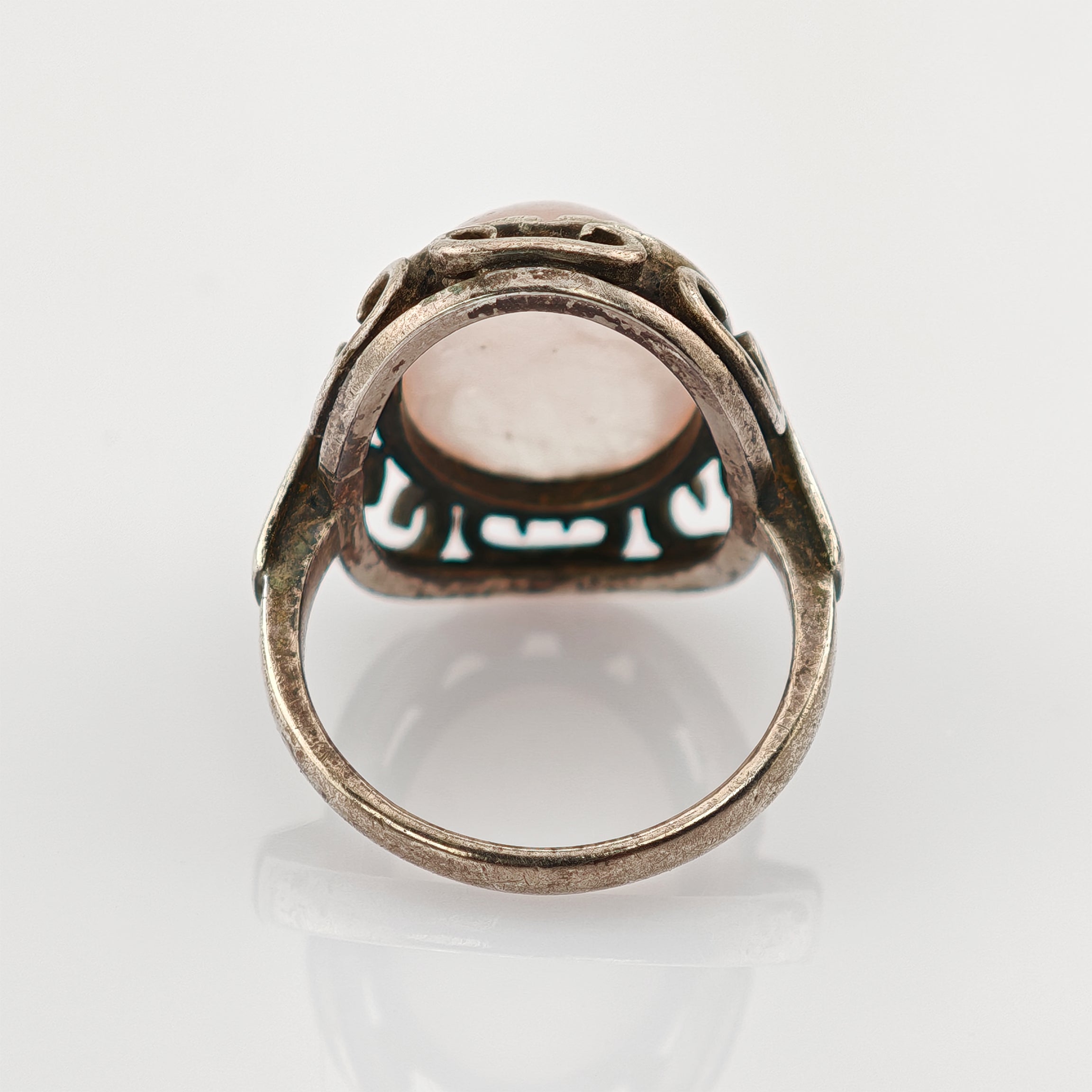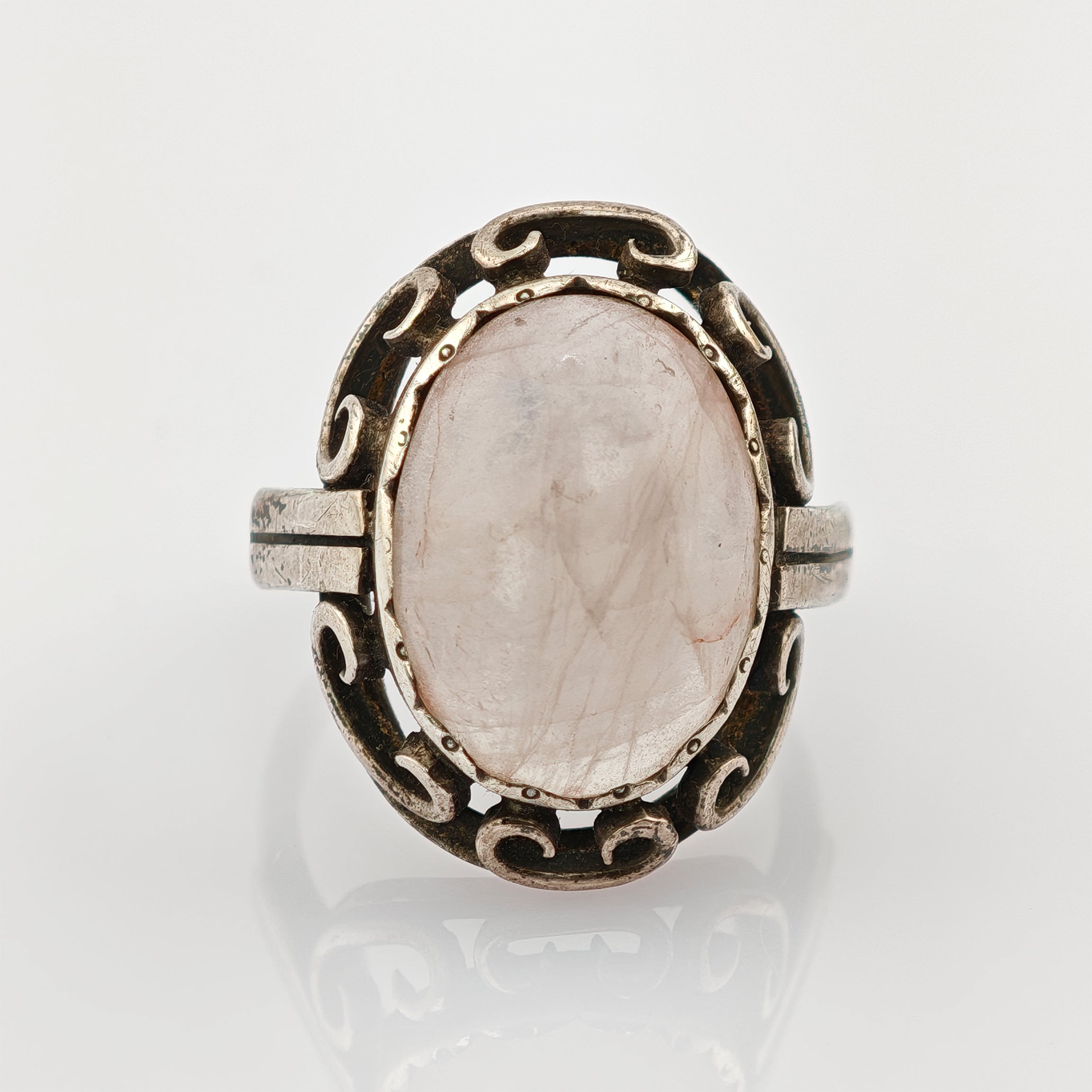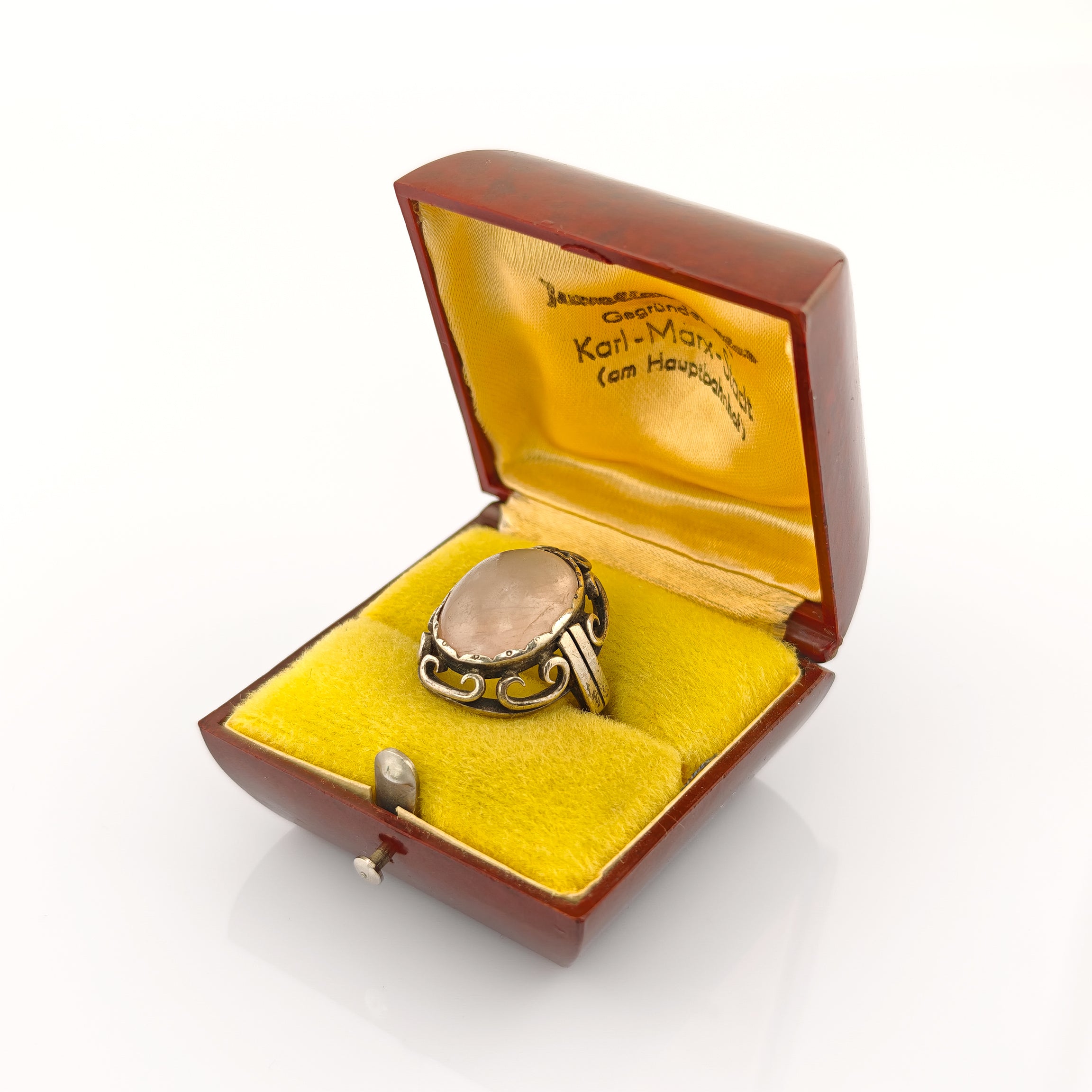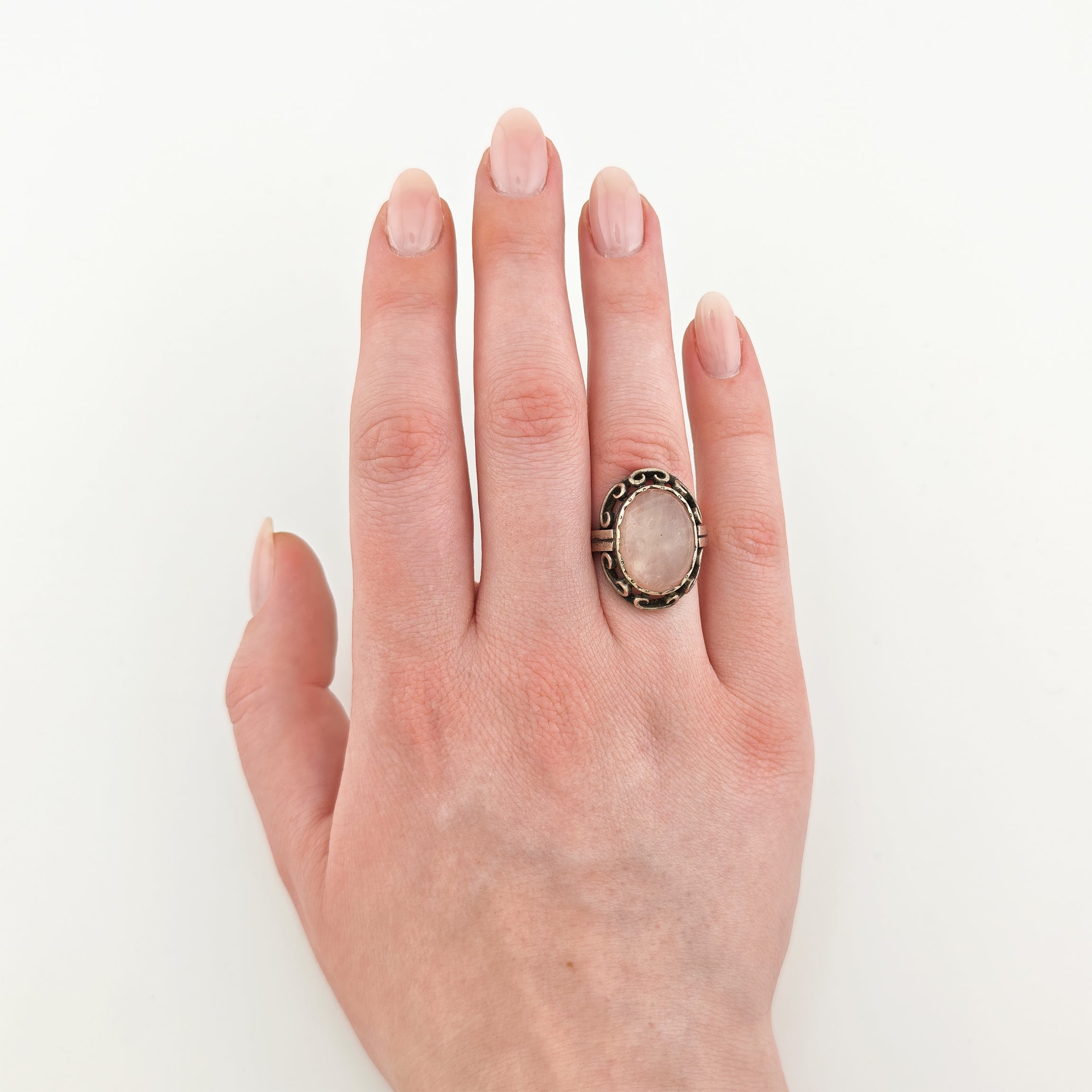 Der „Rose Époque“-Ring ist ein eindrucksvolles Schmuckstück im Stil der frühen 20. Jahrhunderts, gefertigt aus feinem Silber 800 und besetzt mit einem zarten, milchig-roséfarbenen Rosenquarz. Der großflächige Cabochon schimmert sanft im Licht und verleiht dem Ring eine feminine, fast mystische Ausstrahlung.