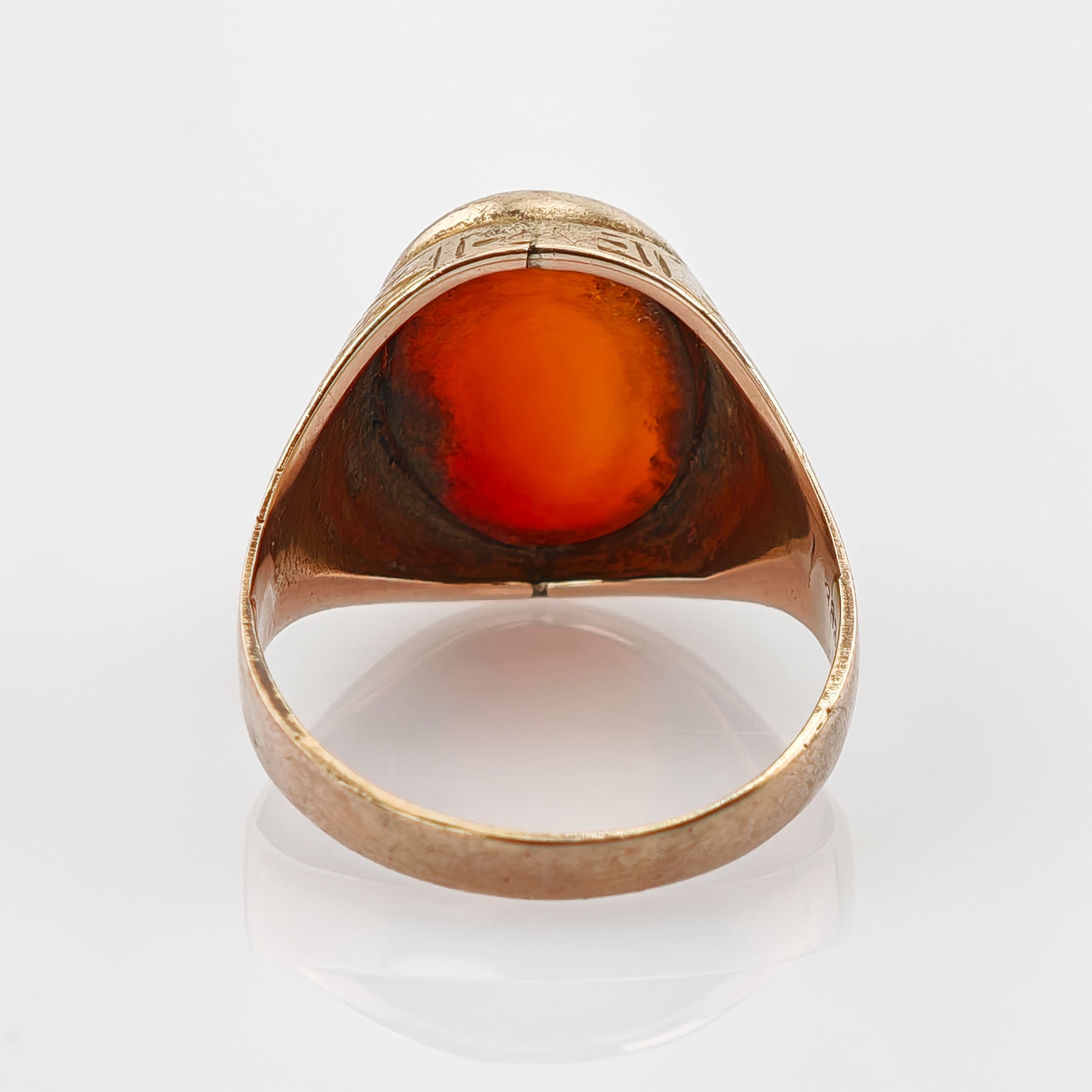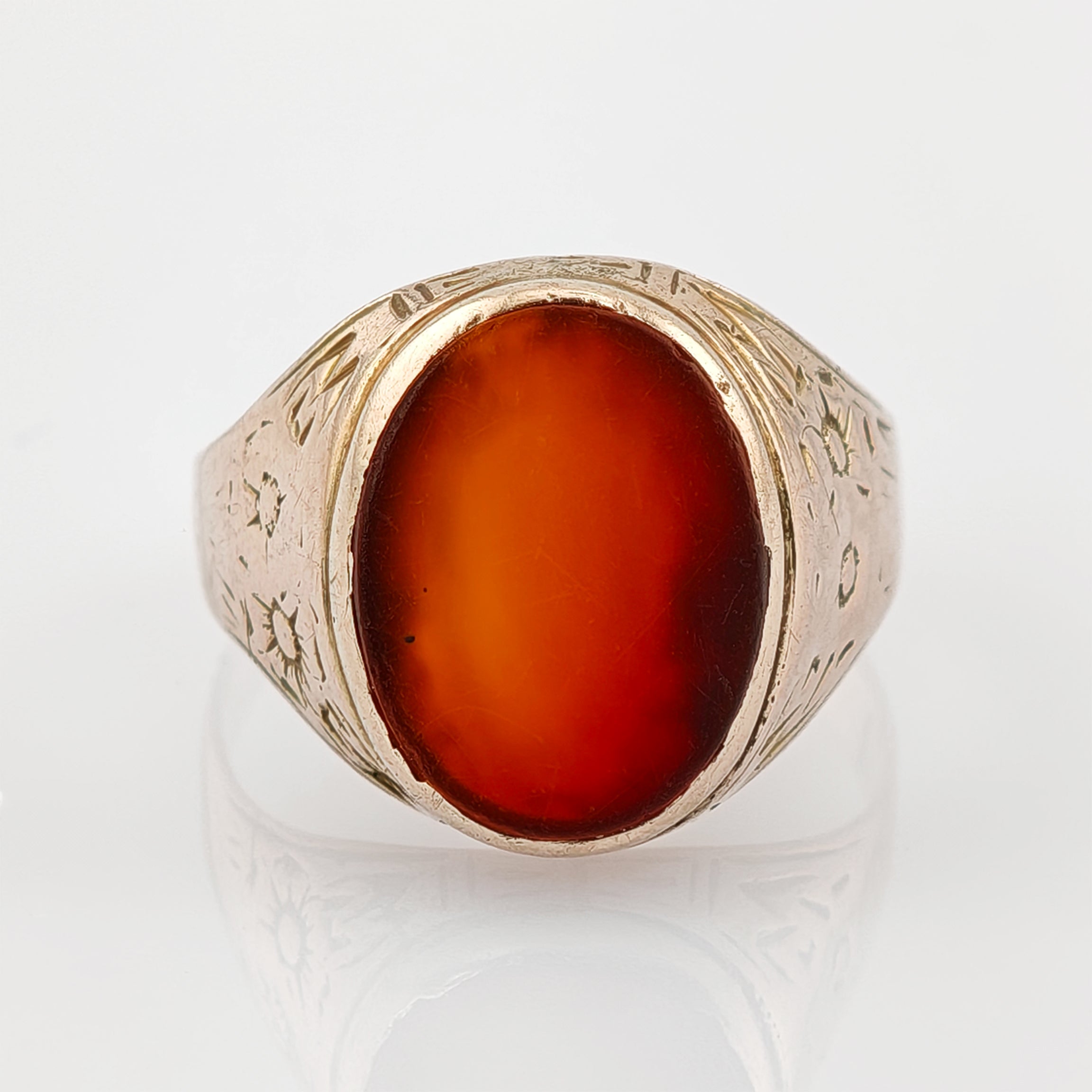 Im Mittelpunkt des Rings thront eine ovale Karneoltafel in tiefem, leuchtendem Orangerot – ein Stein, der seit Jahrhunderten für Lebenskraft, Mut und innere Balance steht. Die feinen Gravuren entlang der Ringschiene unterstreichen den antiken Charakter des Schmuckstücks und verleihen ihm eine besondere Note historischer Raffinesse.