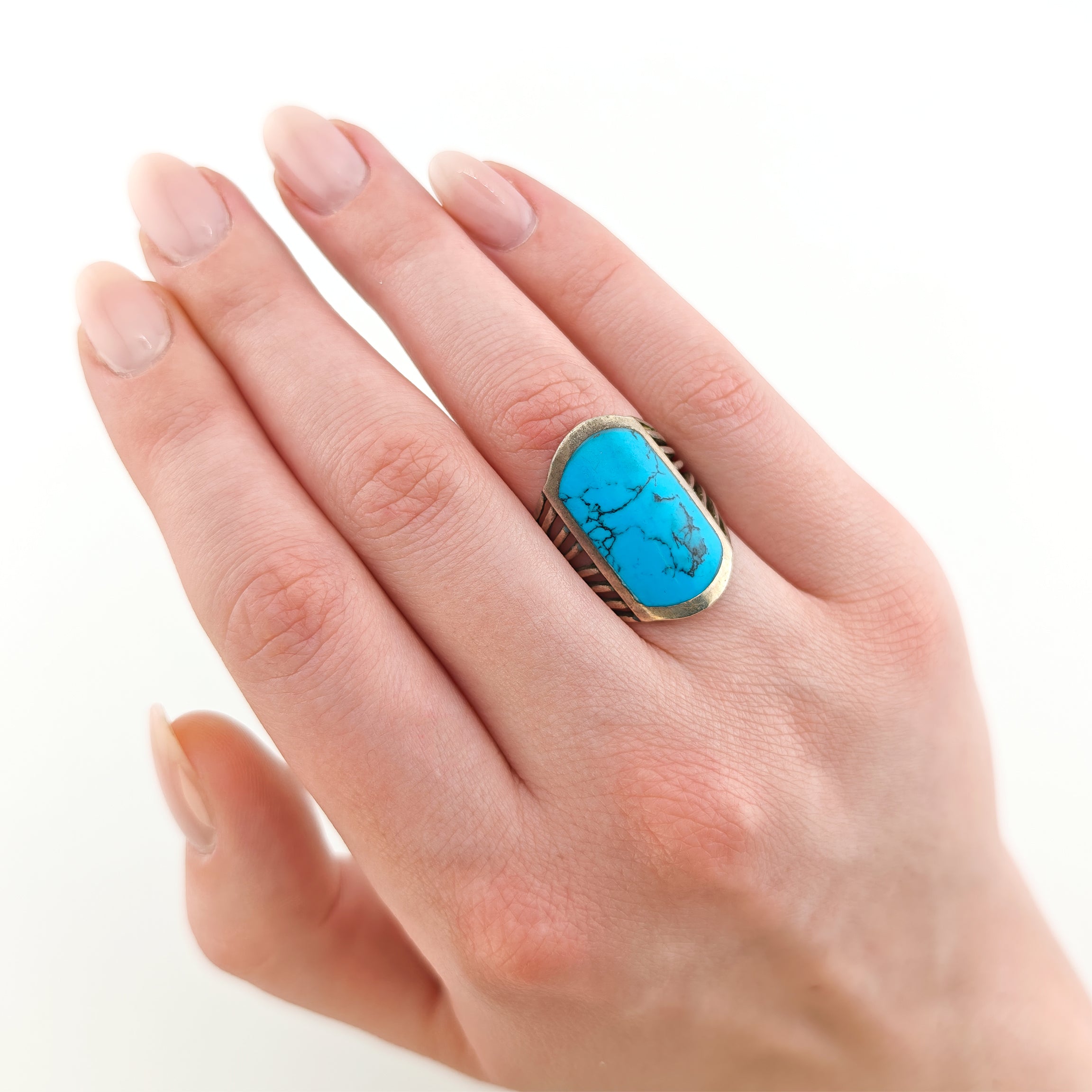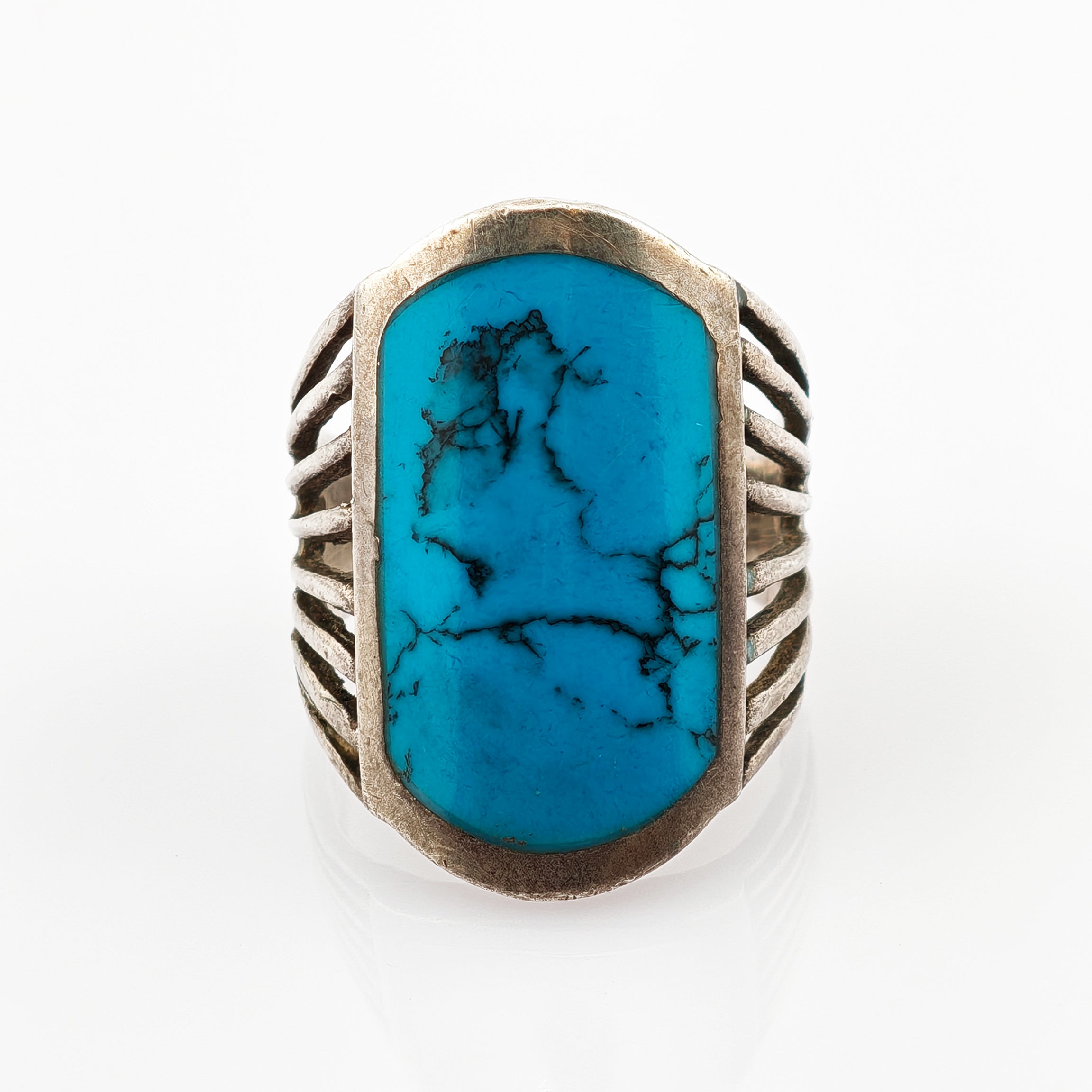 Dieser auffällige Statement-Ring aus 925er Silber trägt einen großen, leuchtend türkisblauen Cabochon mit charakteristischer dunkler Matrix. Der Stein ist in einer schlichten Zargenfassung gefasst und wird von einer breiten, mehrreihigen Ringschiene gehalten, die dem Ring eine markante, handwerkliche Optik verleiht. Die leicht oxidierte Oberfläche unterstreicht den Vintage-/Boho-Charakter.