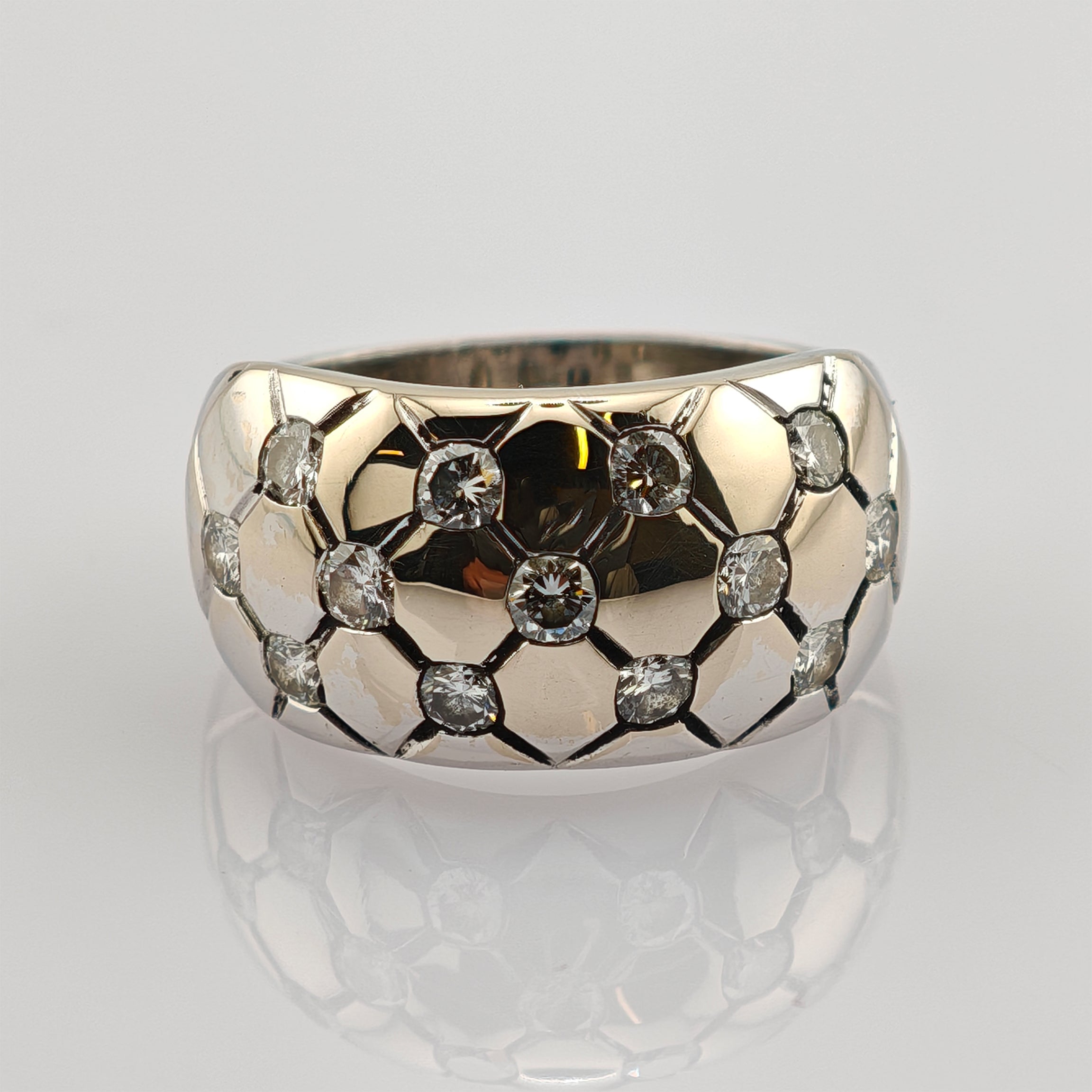 Ein außergewöhnlicher Ring aus 750er Weißgold (18 Karat), der durch sein modernes, grafisches Design sofort auffällt. Die breite, leicht bombierte Ringschiene ist mit einem Waben-/Hexagonmuster versehen – ein stilisiertes Netzwerk aus sechseckigen Feldern, das an eine feine Honigwabe erinnert. In ausgewählten Knotenpunkten funkeln 13 Diamanten mit einem Gesamtgewicht von ca. 0,9 ct und geben dem klaren Relief eine elegante, lebendige Lichtwirkung.