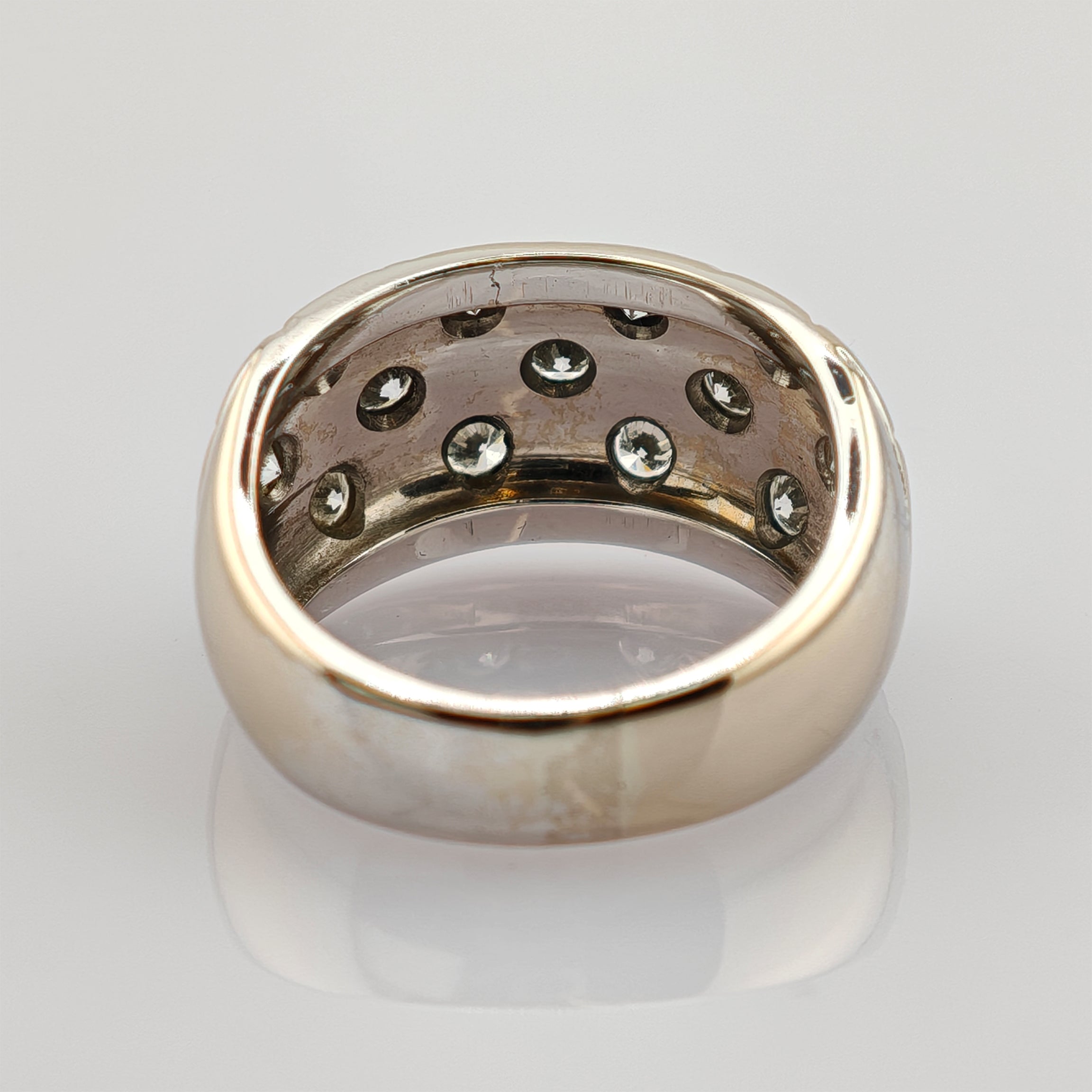 Die Diamanten sind bündig und sicher in die Oberfläche eingearbeitet, sodass eine glatte, angenehm tragbare Fläche entsteht. Das Zusammenspiel aus spiegelndem Weißgold, den dunkel abgesetzten Linien des Musters und dem dezenten Brillanzbesatz wirkt gleichzeitig architektonisch, luxuriös und zeitlos.