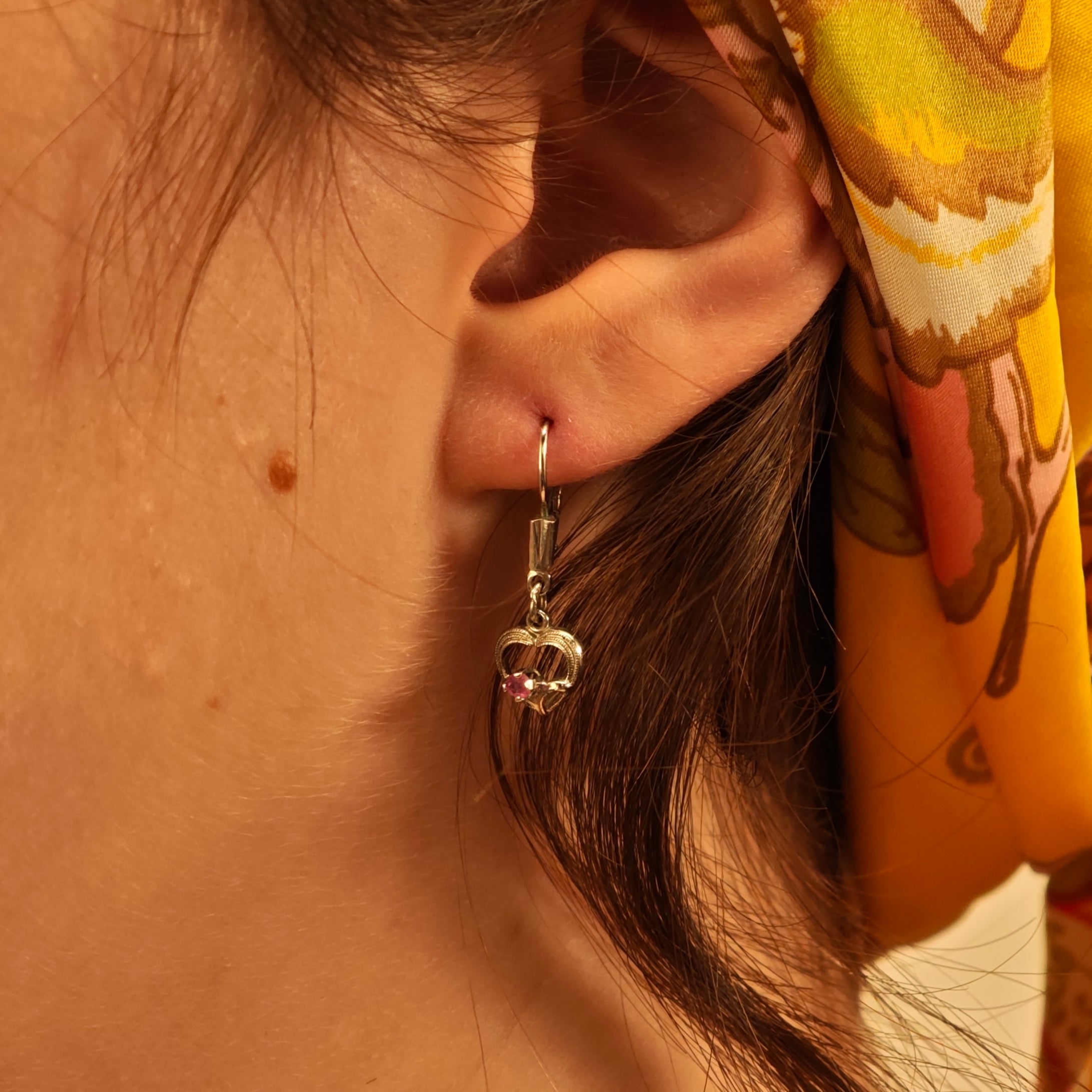 Kleine Silberohrringe mit herzförmigen Anhängern und roten Edelsteinen auf hellem Hintergrund