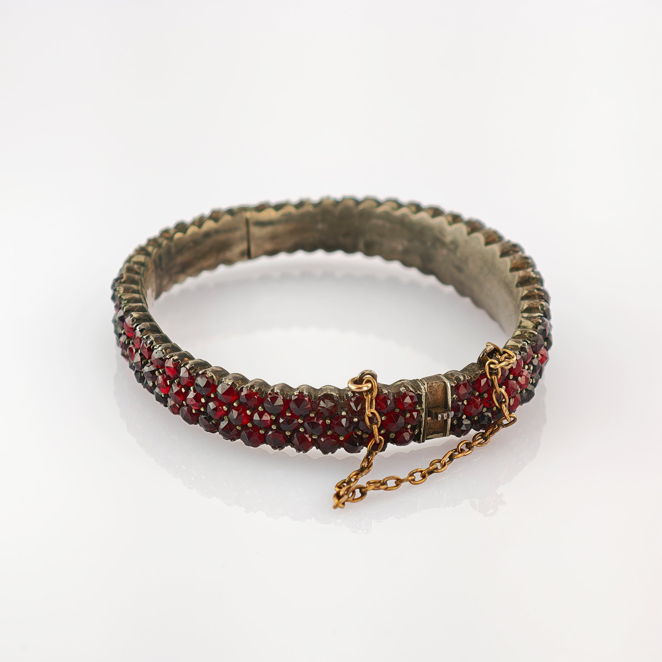 Dieser prachtvolle Granat-Armreif entführt in die Blütezeit des Biedermeier, als böhmische Granate in ihrer tiefroten Farbigkeit hochgeschätzt waren. Drei eng aneinander gesetzte Reihen feurig funkelnder, facettierter Granate zieren das gesamte Band und erzeugen ein faszinierendes Lichtspiel, das von dunkler Glut bis zu rubinrotem Schimmer reicht. Die elegante, leicht taillierte Form wird durch die feine Steckschließe mit Sicherheitskettchen harmonisch vollendet.