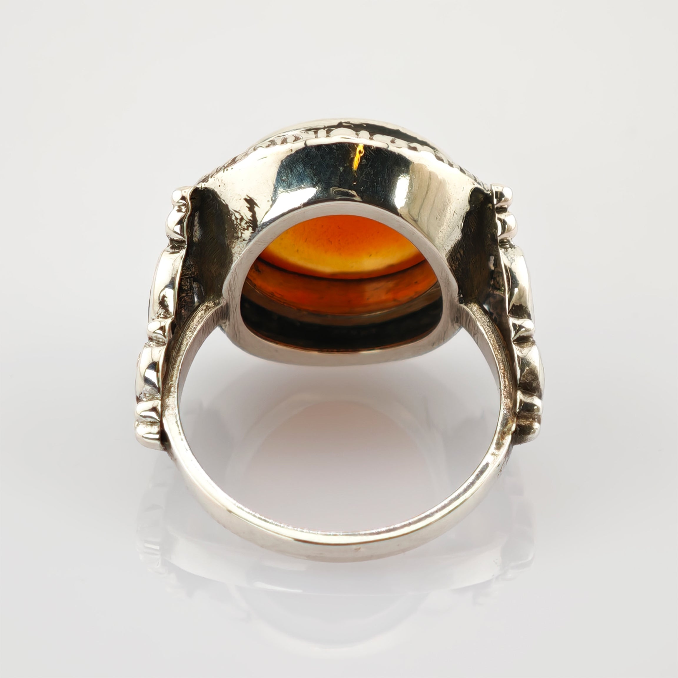 Silberring mit kunstvollem Muster und großem poliertem orangefarbenem Edelstein
