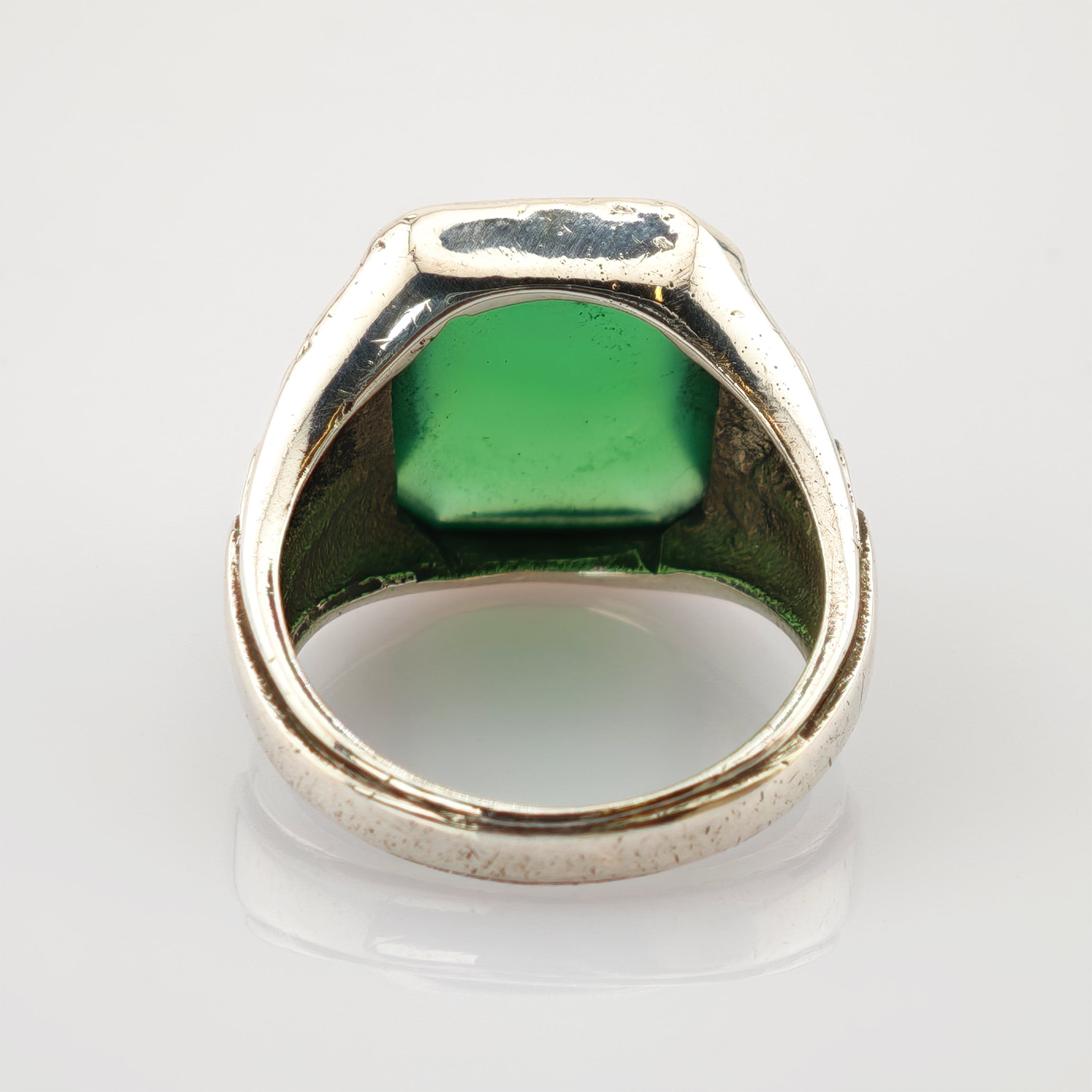 Das kräftige Silberdesign mit seinen geometrisch abgestuften Schultern betont den Charakter des Rings und erinnert an maskuline Schmuckformen der 1950er- bis 1970er-Jahre. Der grüne Nephrit, ein Symbol für Ruhe und Stärke, bildet dabei den strahlenden Mittelpunkt.