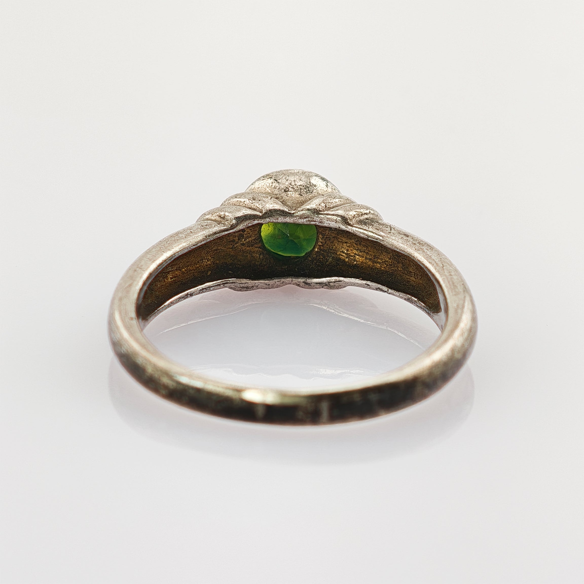 Die Fassung geht fließend in die Ringschiene über und wird von sanft modellierten, fast wickelartigen Silberlinien begleitet. Diese leicht skulpturale Form verleiht dem Ring Charakter, ohne aufdringlich zu sein. Die dezente Patina und feine Tragespuren unterstreichen den Vintage-Charme und geben dem Stück eine schöne Tiefe.
