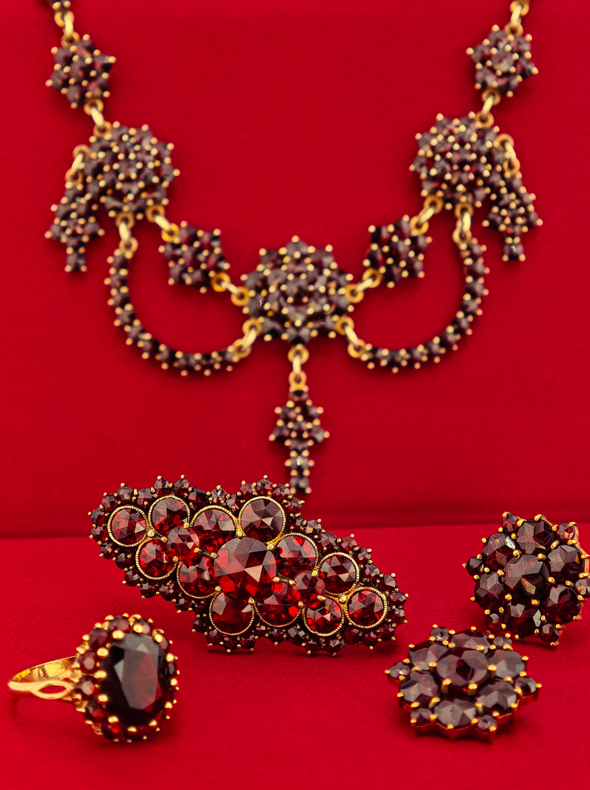 Im 19. Jahrhundert erlebte der böhmische Granat seine Blütezeit. Viktorianischer Schmuck setzte auf Cluster aus vielen kleinen, blutroten Steinen, die wie glühende Kohlen wirkten – ein Trend, der bis heute anhält.