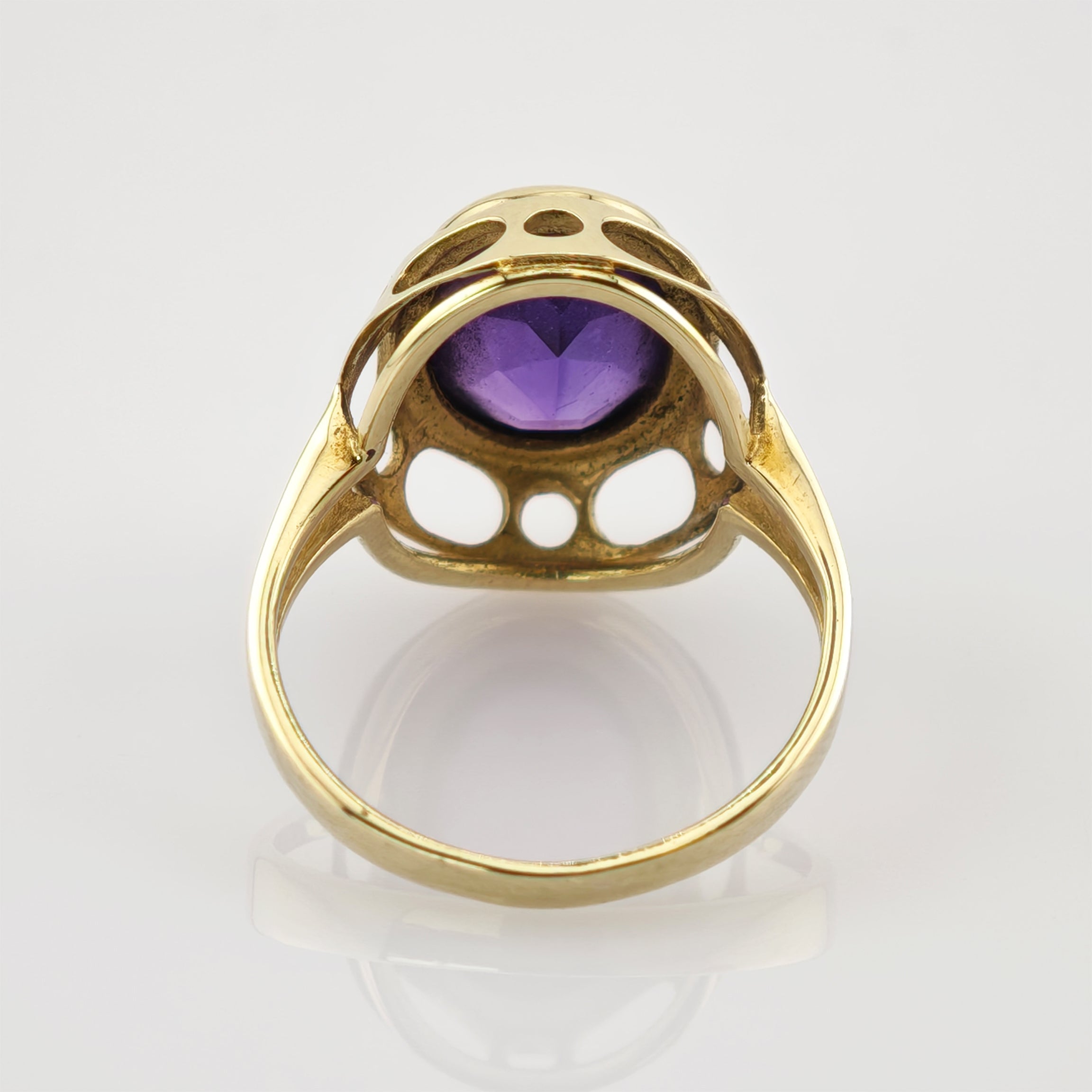 Goldener Ring mit ovalem Amethyst und offenem Design mit ovalen und runden Ausschnitten.