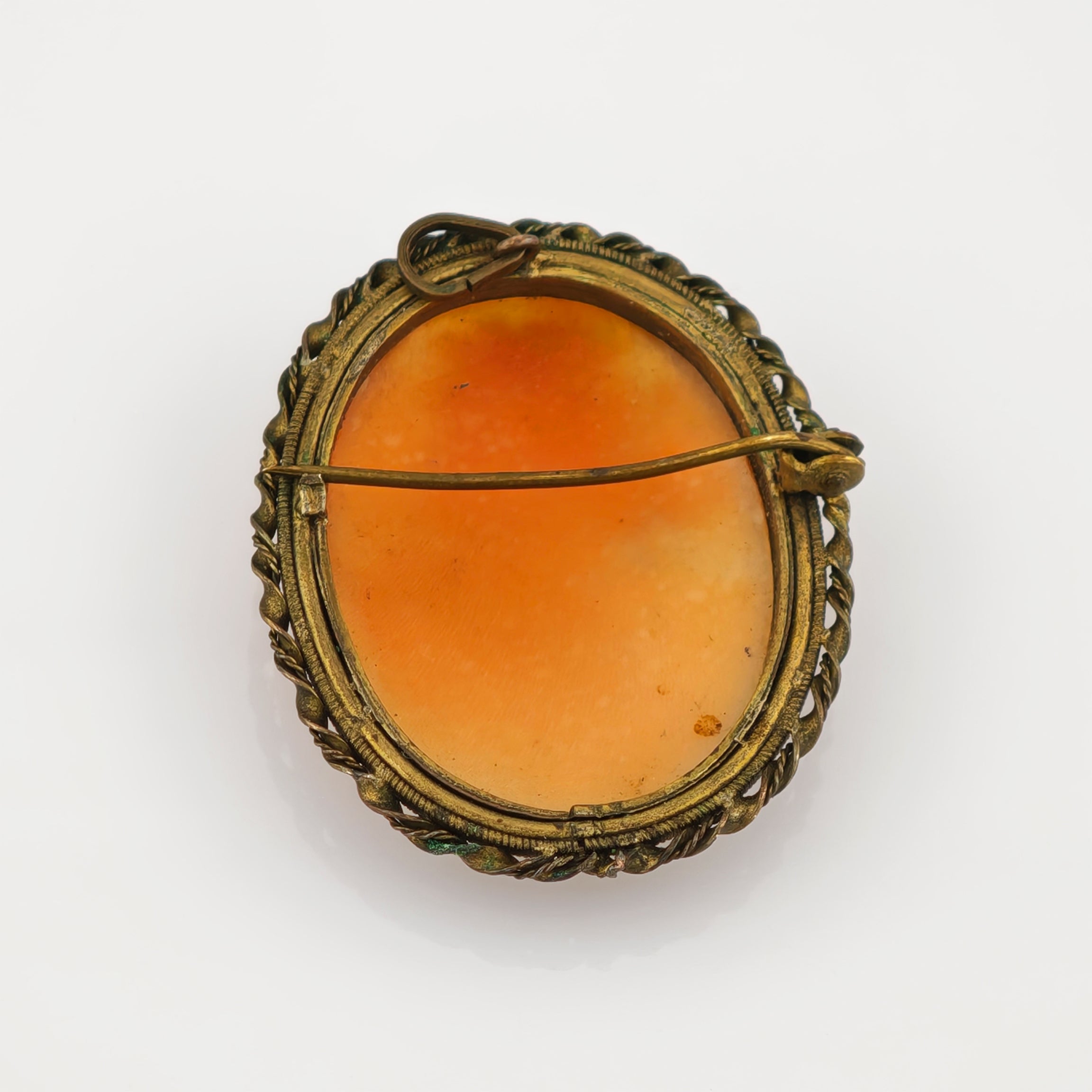 Diese kunstvoll gearbeitete Brosche mit Anhängerfunktion ist ein wunderschönes Beispiel klassischer Kameenkunst. Handgeschnitzt aus Muschelschale, mit der Darstellung eines idealisierten Männerprofils in feinster Reliefarbeit. Der Kranz aus Eichenblättern deutet auf eine allegorische Figur der Stärke, Weisheit oder des Triumphs hin – möglicherweise Apoll oder Bacchus, Götter der Kunst und Lebensfreude.