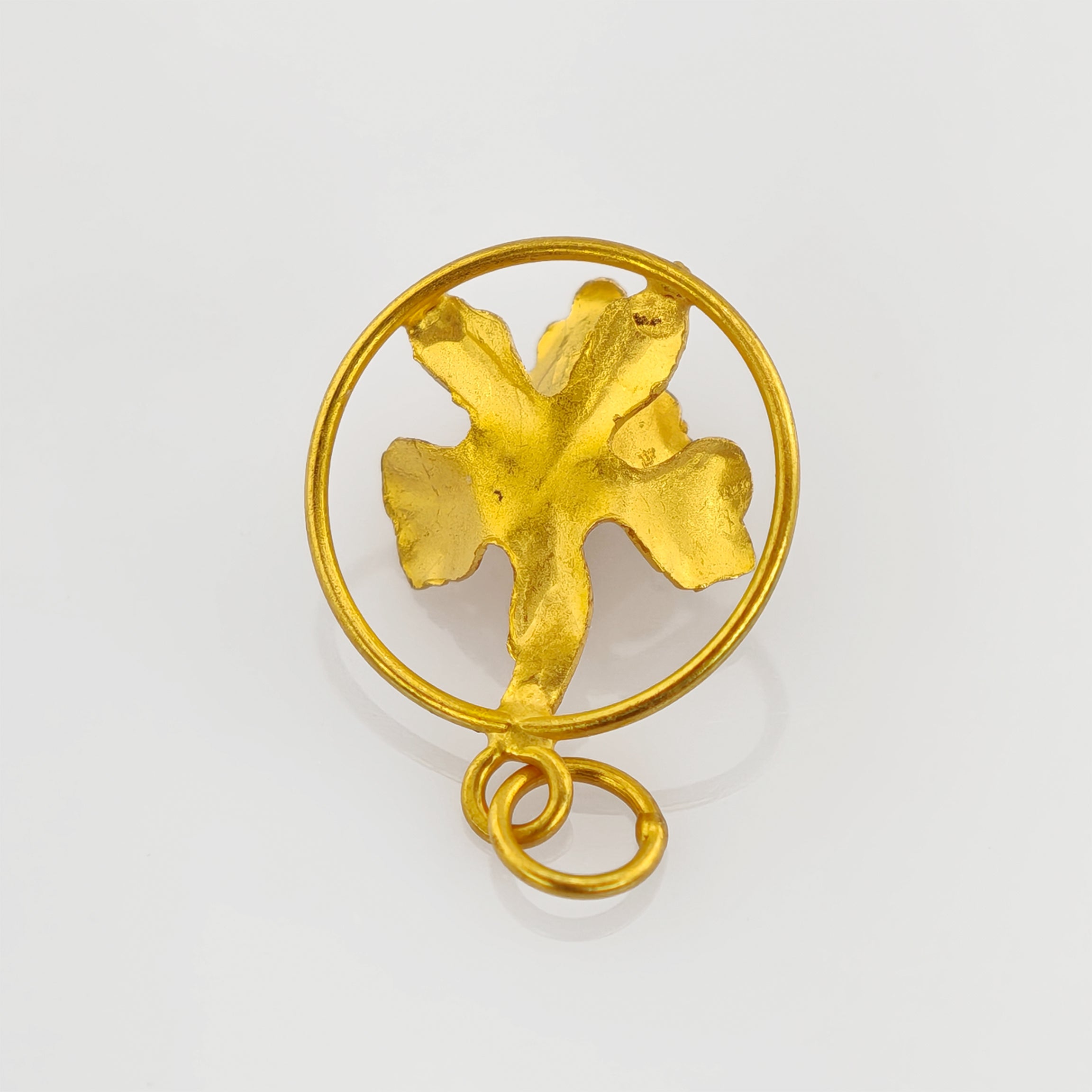 Als Goldanhänger mit Perle verbindet dieses Schmuckstück Natürlichkeit mit zeittypischem Ausdruck. Es wirkt wie ein kleines Relief aus Gold, das die Vergänglichkeit einer Blüte in dauerhaftem Material bewahrt. Getragen entfaltet es eine stille Präsenz, die nicht laut sein muss, um wahrgenommen zu werden. Zwischen Licht und Schatten, zwischen Kreis und Blüte, entsteht ein feines Gleichgewicht – ein Schmuckstück, das die Poesie organischer Formen in sich trägt und sie behutsam weitergibt.