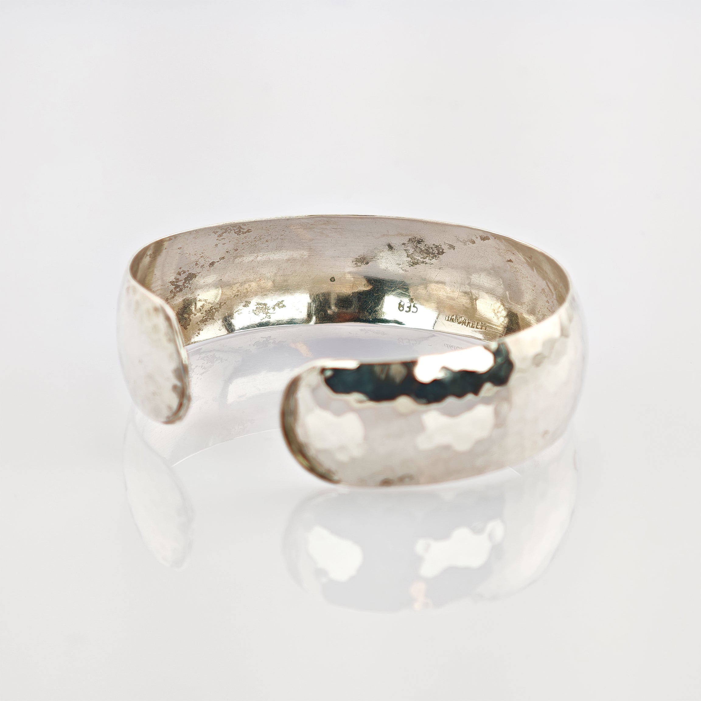 Die Gestaltung folgt einer modernen, sachlichen Formensprache, wie sie seit der zweiten Hälfte des 20. Jahrhunderts in der Silberschmiedekunst geschätzt wird. Statt ornamentaler Details steht hier die Oberfläche selbst im Mittelpunkt. Das Hämmern ist nicht nur dekoratives Element, sondern Ausdruck handwerklicher Arbeit – jeder Schlag formt das Metall, verdichtet es und hinterlässt eine individuelle Spur. Die offene Form des Armreifs erlaubt ein unkompliziertes Anlegen und unterstreicht die klare, architektonische Wirkung des Stücks.