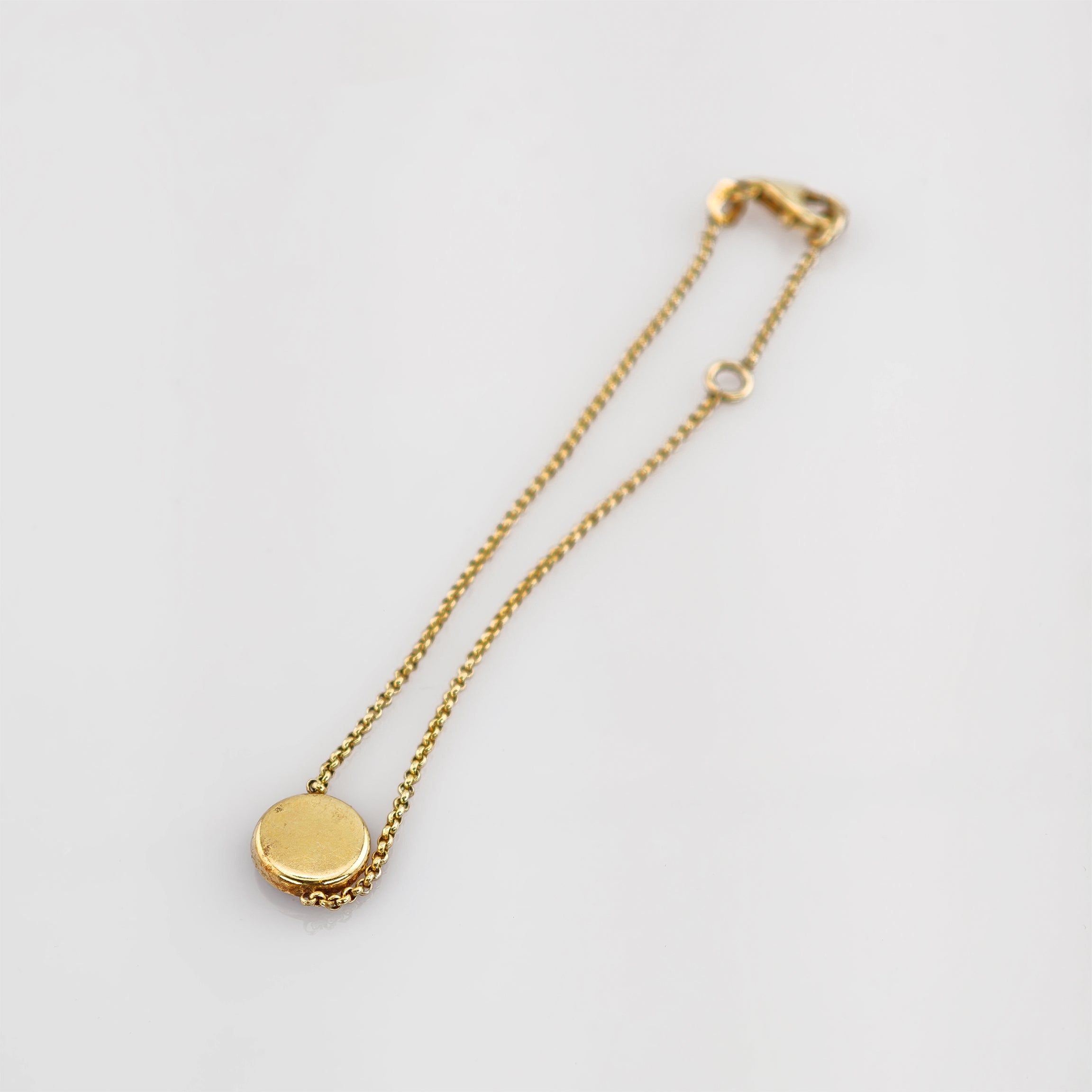 Dieses vergoldete Silberarmband vereint klassische Bildtradition mit feiner Zurückhaltung. Im Mittelpunkt steht eine ovale Kamee in zartem Relief: das helle Profil einer weiblichen Gestalt hebt sich ruhig von einem tiefblauen Grund ab. Die Figur wirkt an antike Vorbilder angelehnt – mit weich fallendem Haar und anmutiger Haltung, eingefasst in eine schlichte runde Zarge. Die filigrane Gliederkette hält sich bewusst zurück und lenkt den Blick auf das kleine Bildmedaillon, das wie ein Fenster in vergangene Zeiten erscheint.
