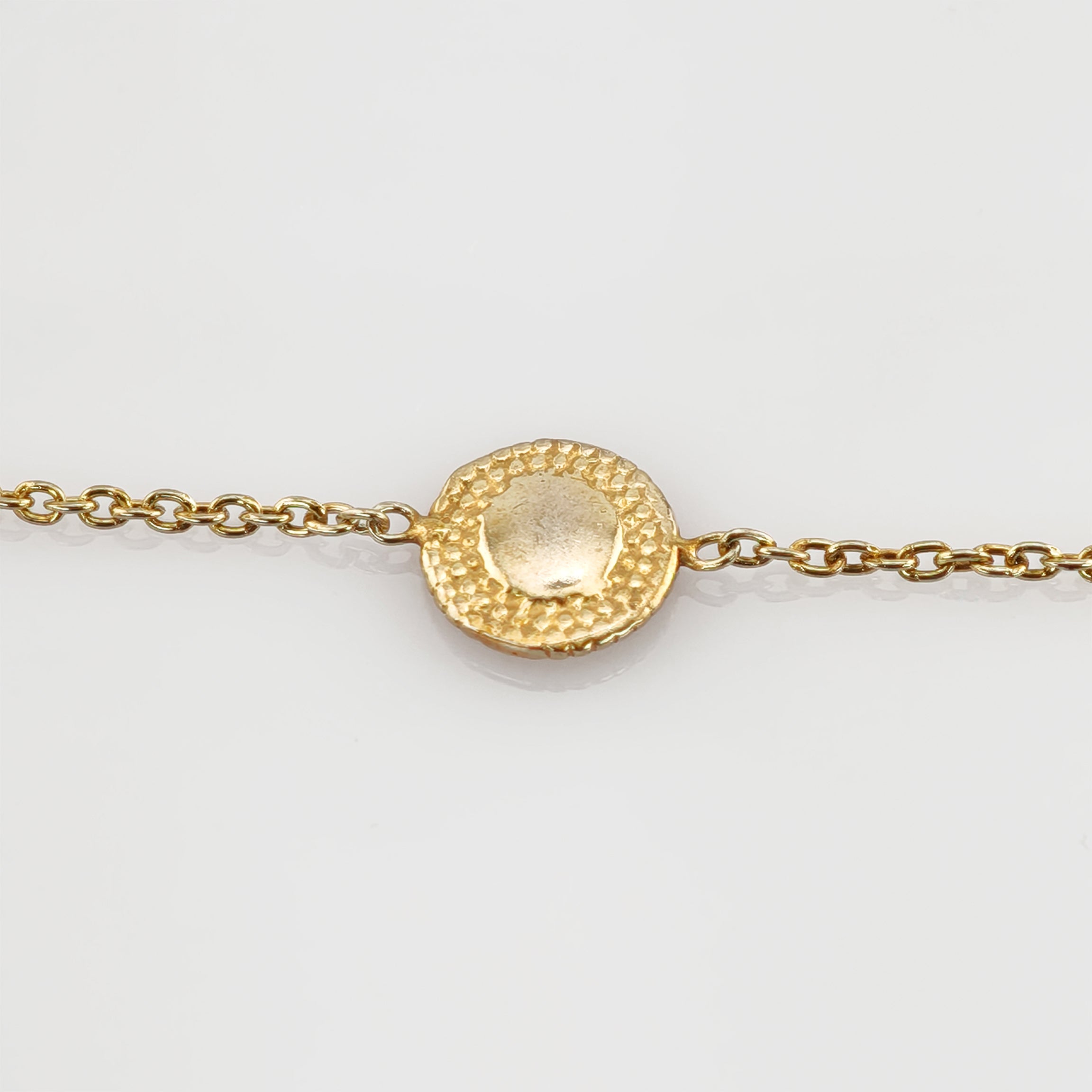Dieses zarte Armbändchen aus vergoldetem Silber verbindet feine Leichtigkeit mit klarer Form. Drei runde Zierelemente sind gleichmäßig in die filigrane Kette eingefügt und bilden ruhige Blickpunkte entlang des Handgelenks. Ihre leicht gewölbte Mitte wird von einer dezent strukturierten Oberfläche umrahmt, die das Licht sanft bricht und dem Goldton eine lebendige Tiefe verleiht. Die feine Gliederkette hält sich bewusst zurück und lässt den kleinen Medaillons Raum zur Wirkung.
