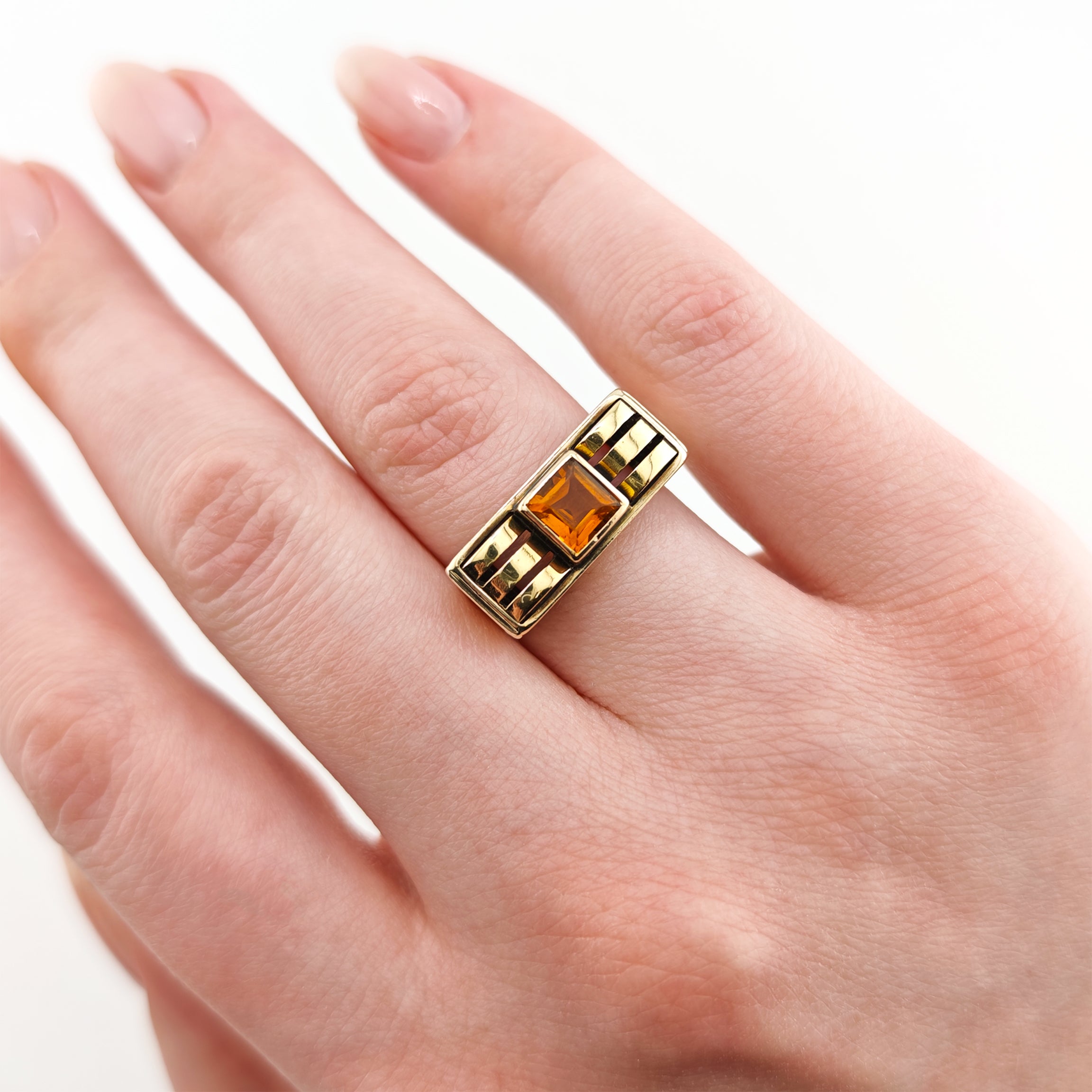 Ein ausdrucksstarkes Schmuckstück der späten Art-Déco-Zeit: Dieser markante Ring vereint architektonische Klarheit mit edlem Glanz. Im Mittelpunkt steht ein quadratisch facettierter Citrin von intensiver, goldener Farbigkeit, der in einer schlichten Zargenfassung strahlt. Seine warme Leuchtkraft kontrastiert elegant mit der strukturierten, geometrischen Linienführung des breiten Ringkopfes.