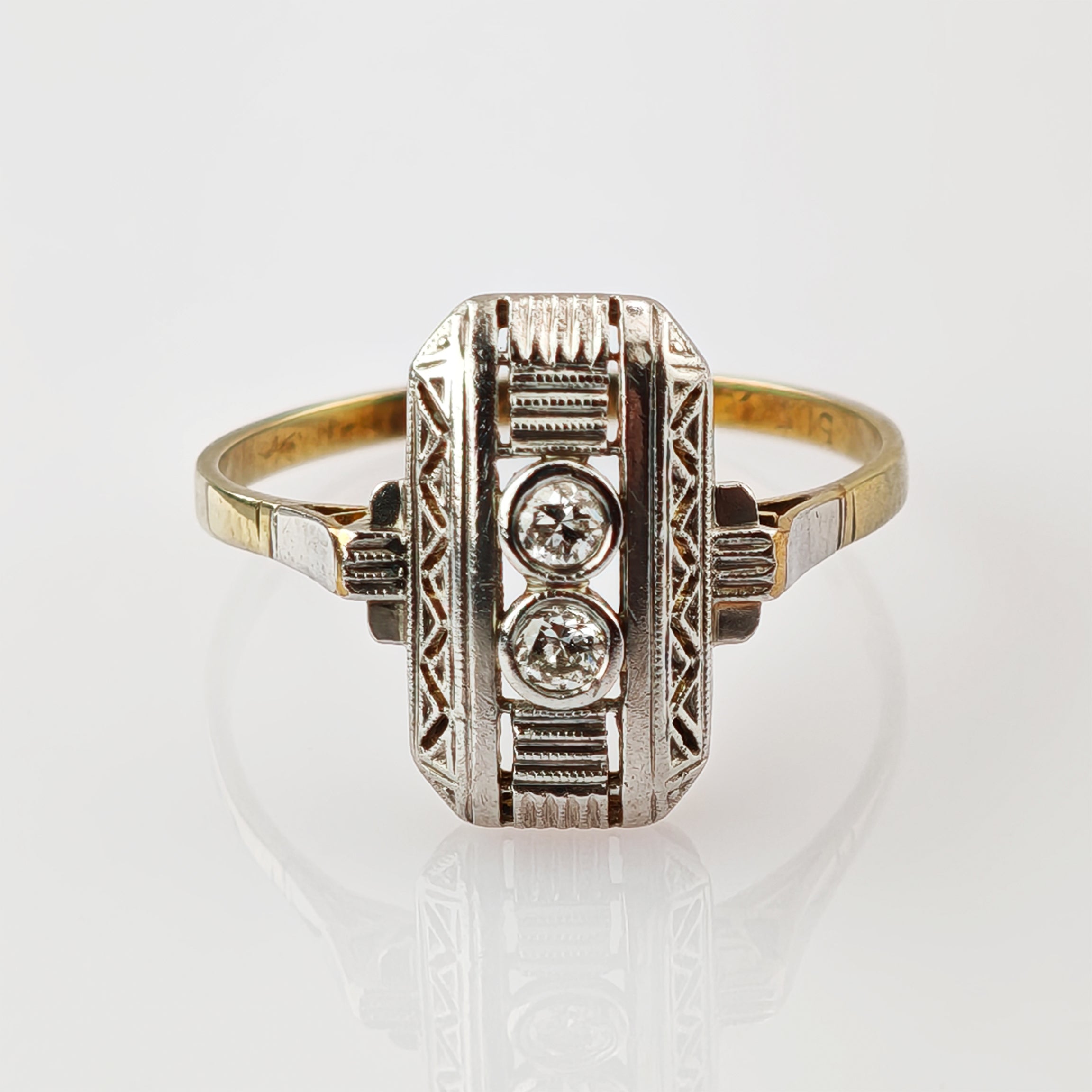 Dieser elegante Damenring verkörpert den unverwechselbaren Stil der Art-Déco-Ära: klare Linien, geometrische Formen und raffinierte Kontraste. Der rechteckige Ringkopf ist teilplatiniert und zeigt zwei funkelnde Brillanten (zusammen ca. 0,1 ct) in zarten Zargenfassungen. Feine Gravuren und ornamentale Reliefstrukturen verleihen dem Design Tiefe und architektonische Strenge, wie sie für die 1920er Jahre typisch ist.