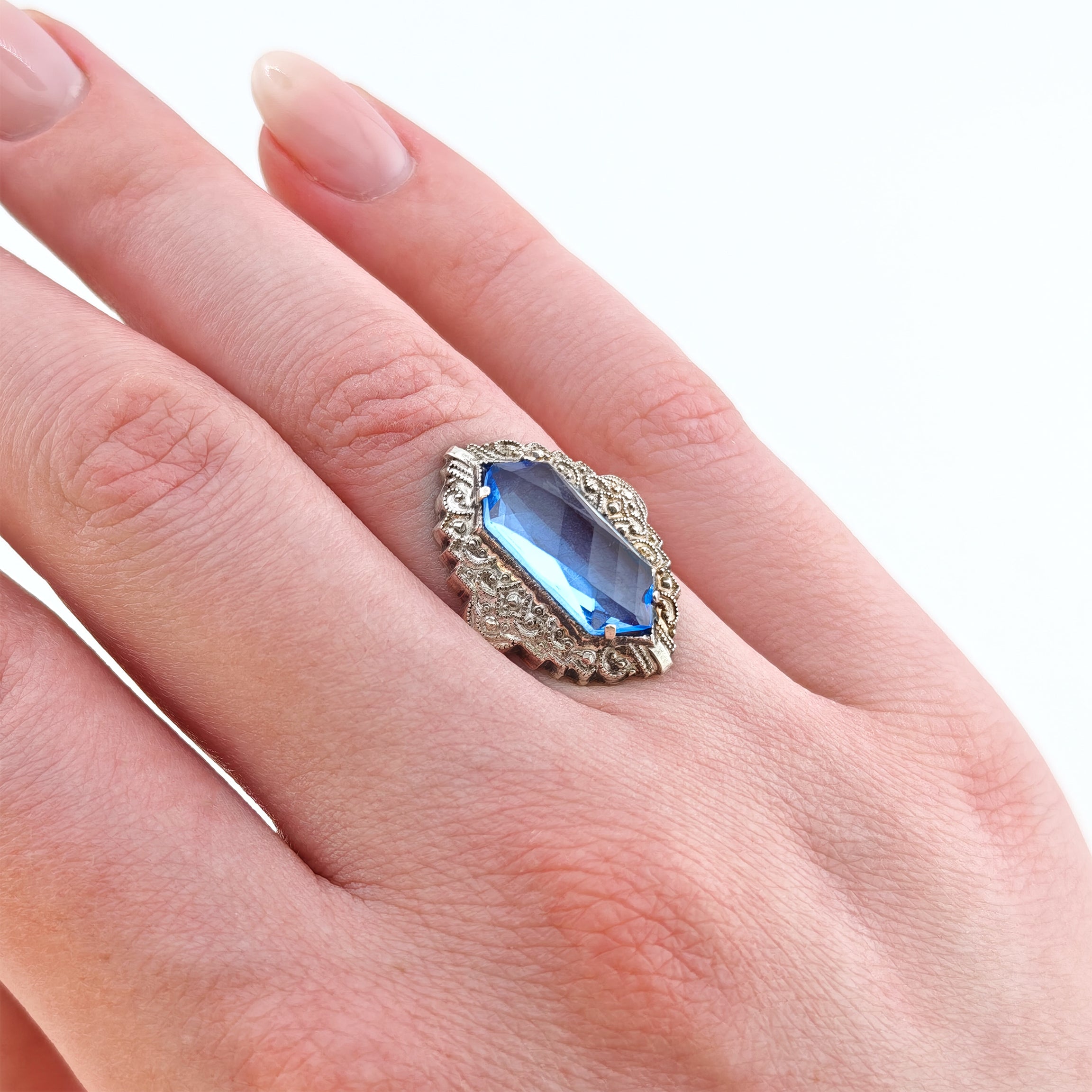 Dieser prachtvolle Ring aus 835er Silber zieht durch seinen großen, facettierten Glasstein in kräftigem Blau sofort die Blicke auf sich. Der Stein ist von einer reich verzierten Ornamentfassung umgeben, die dem Schmuckstück eine verspielte, fast barocke Ausstrahlung verleiht. Die Kombination aus intensivem Farbglanz und detailreicher Silberarbeit macht den Ring zu einem echten Blickfang.