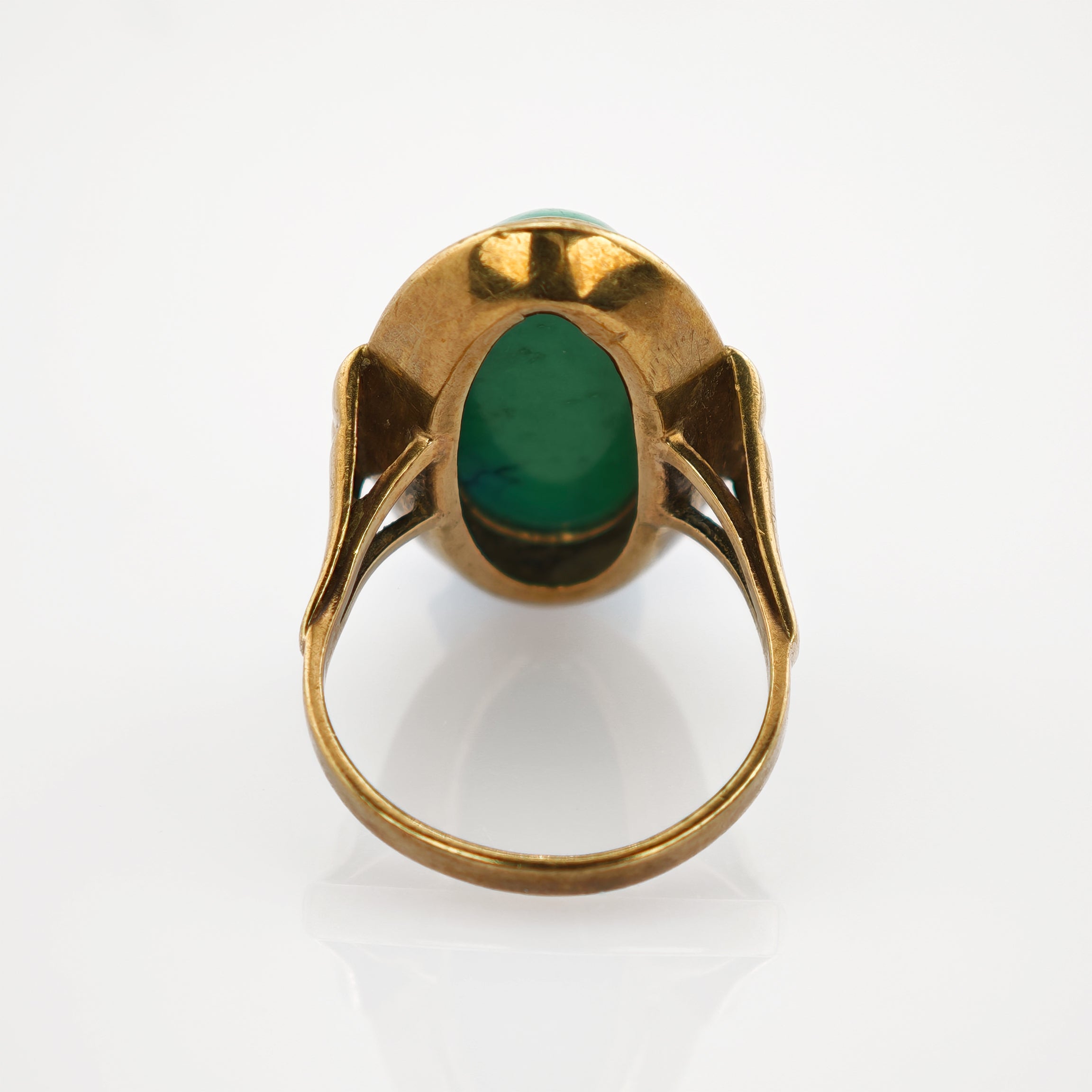 In seiner Gestaltung erinnert das Schmuckstück an die 1960er Jahre oder an etwas frühere Entwürfe, in denen große Cabochons und markante Fassungen eine beinahe skulpturale Wirkung entfalteten. Der längliche Aufbau des Ringkopfes betont die natürliche Form des Steins, während das Gold mit seiner warmen, satten Oberfläche einen bewussten Gegenklang zum kühlen Ton des Türkis setzt. Seit Jahrhunderten wurde Türkis wegen seiner Farbe und seiner symbolischen Bedeutung geschätzt; er galt als Stein des Schutzes, der Weite und des inneren Gleichgewichts. Gerade in dieser Fassung kommt jene Wirkung besonders schön zur Geltung. Das dunkle Matrixmuster durchzieht das helle Blaugrün wie feine Linien einer alten Karte und verleiht dem Stein Charakter und Tiefe. So zeigt sich dieser antike Goldring mit Türkis als Schmuckstück, das Natur und Gestaltung in eine ruhige, tragbare Form bringt.
